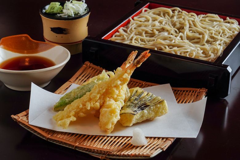 「海老天ぷらそば」1300円。そばはセイロ(冷たい)とかけ(温かい)から選べる