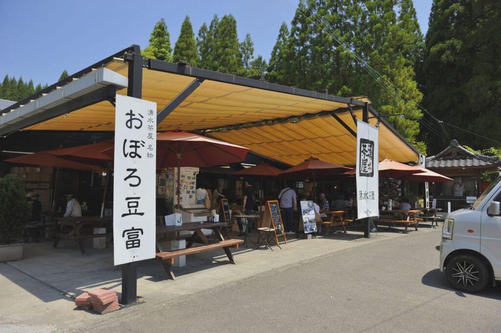 近くに湧き出る名水、小津留湧水で作る店自慢の「豆富(とうふ)」がトッピングされた一杯は、こんにゃく麺を使用。ヘルシー食材のコラボレーションを楽しむことができます。食後は同じ湧水を使った「豆乳生プリン」250円をどうぞ。