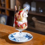 別府湾を見下ろす高台に位置する隠れ家的喫茶店。1階ではお好み焼きを、2階は喫茶フロアとして、コーヒーや種類豊富なパフェ、和スイーツなどのカフェメニューを楽しめる。食事メニューとパフェのセットもあり、心もお腹も満たされること間違いなし。