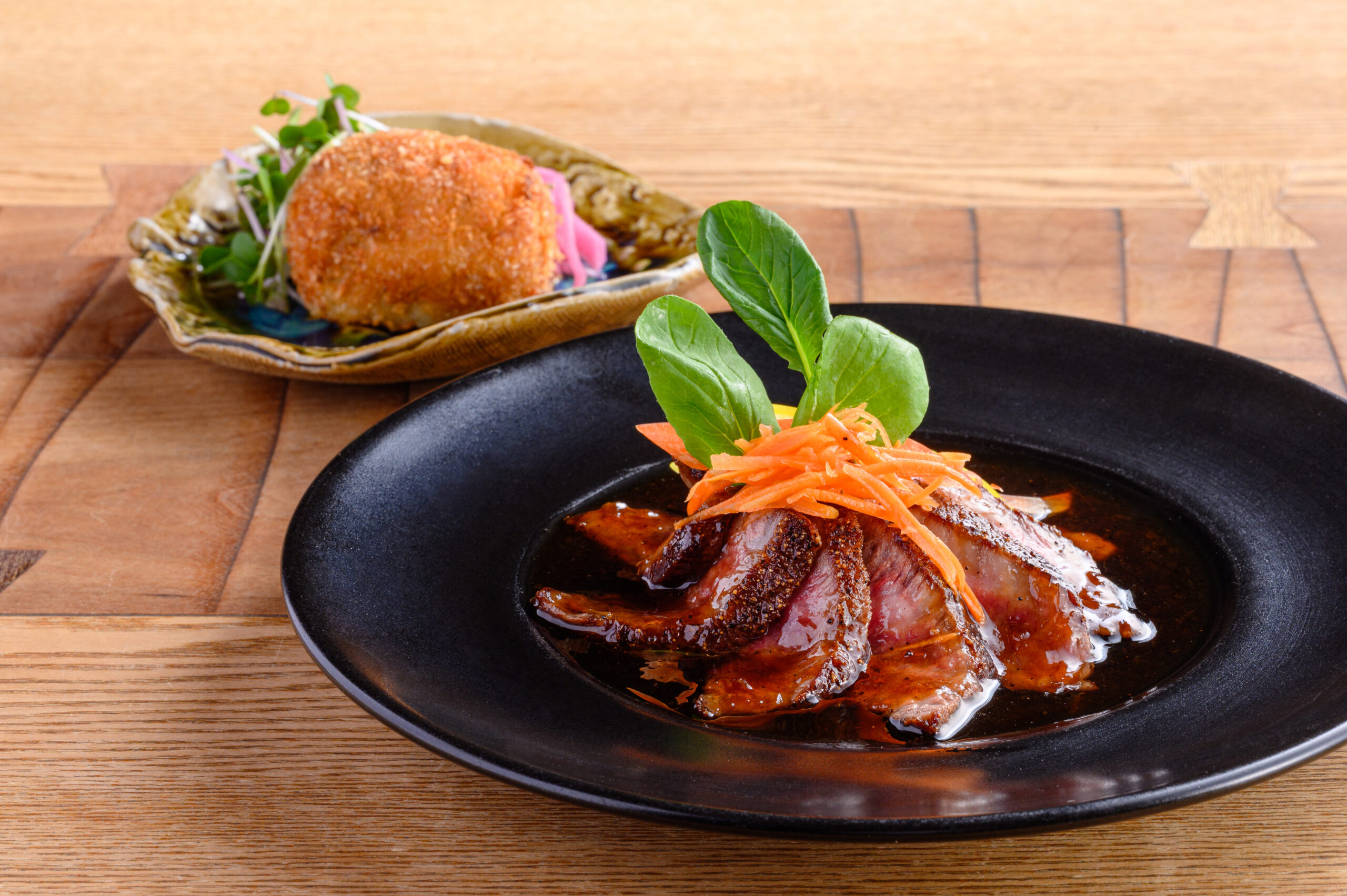 手前から「和牛モモのステーキ」1800円、「リッチコロッケ」350円