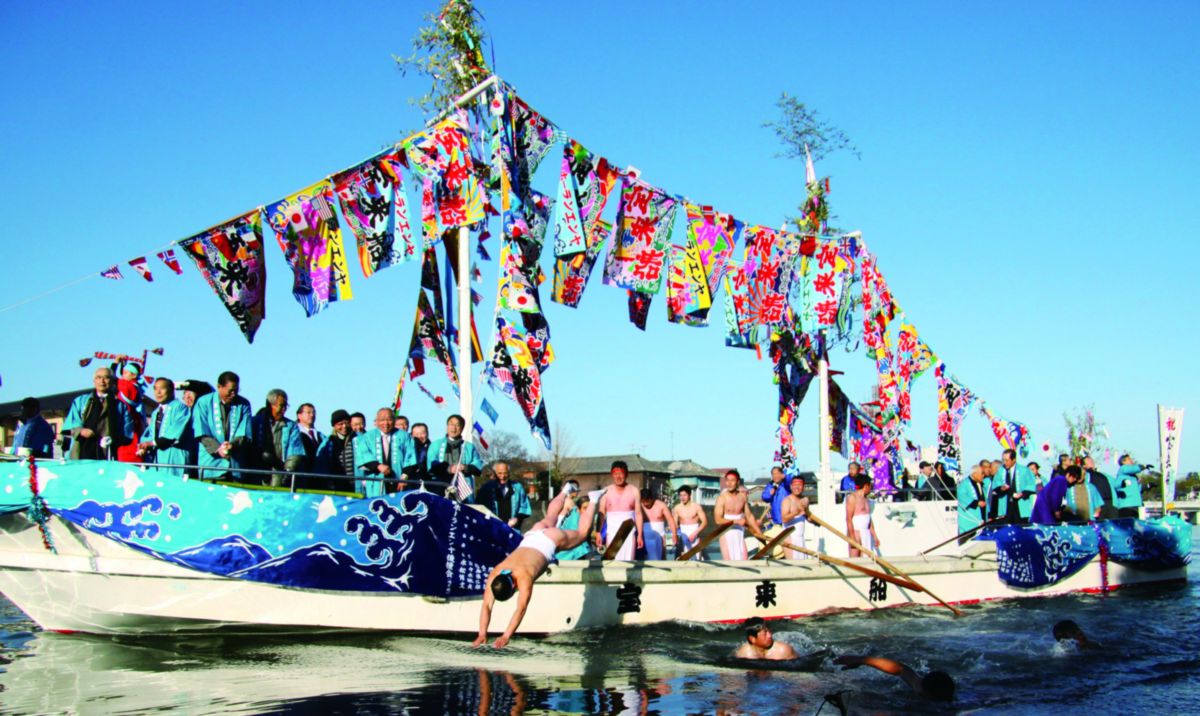 江戸中期、豊漁と航海安全を祈願して始まったとされる新年を祝う伝統行事「ホーランエンヤ」。赤や青、黄の大漁旗や吹き流しなどで鮮やかに装飾された「宝来船」が豊後高田市内を流れる桂川をさかのぼる。すると川岸の観衆からご祝義やお供え物が投げられ、締め込み姿の若者たちが極寒の川に飛び込み受け取りに行く。