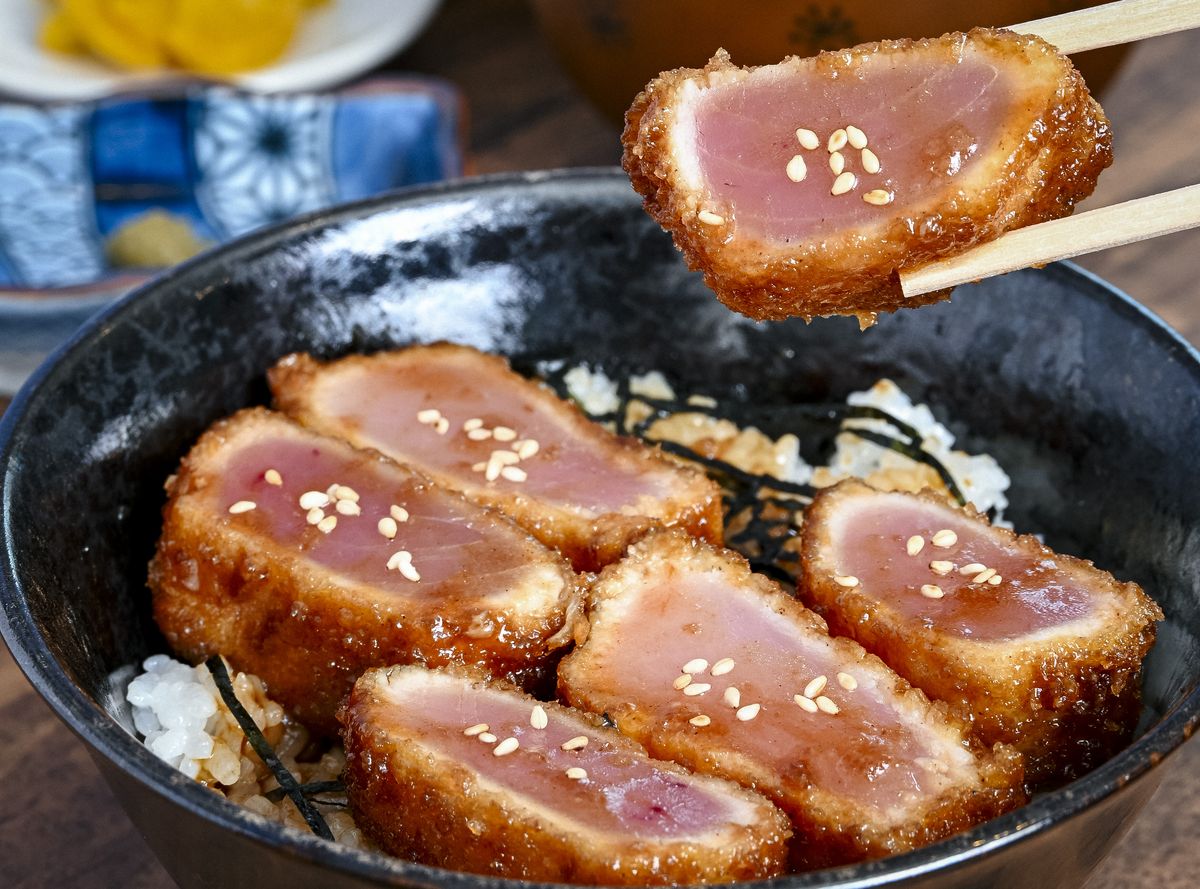 一度も冷凍することなく調理する“生マグロ”の新鮮さは折り紙付き。柵の状態のまま短時間でサクッと揚げることで、肉厚ながら歯でスッと噛み切れるほど柔らかなレアに仕上がっている。甘辛いタレのままいただくのはもちろん、柚子胡椒で味変するのもオススメ!