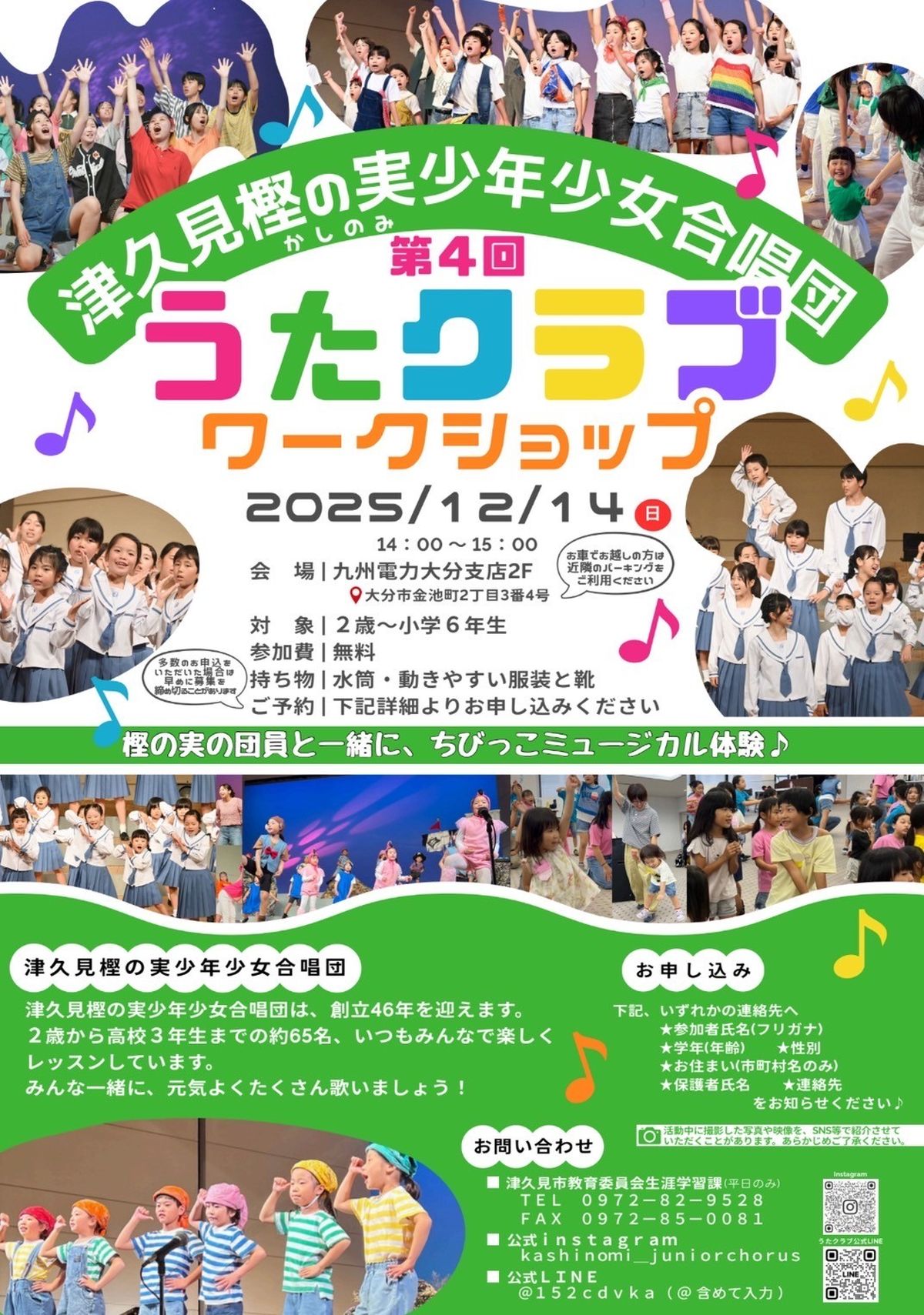 問い合わせ・申し込み先:TEL0972-82-9528、FAX0972-82-9528(津久見樫の実会事務局/津久見市教育委員会 生涯学習課)、公式Instagram:@kashinomi_juniorchorus、公式LINE@152cdvka ※申し込みが多い場合は早めに締め切る場合あり