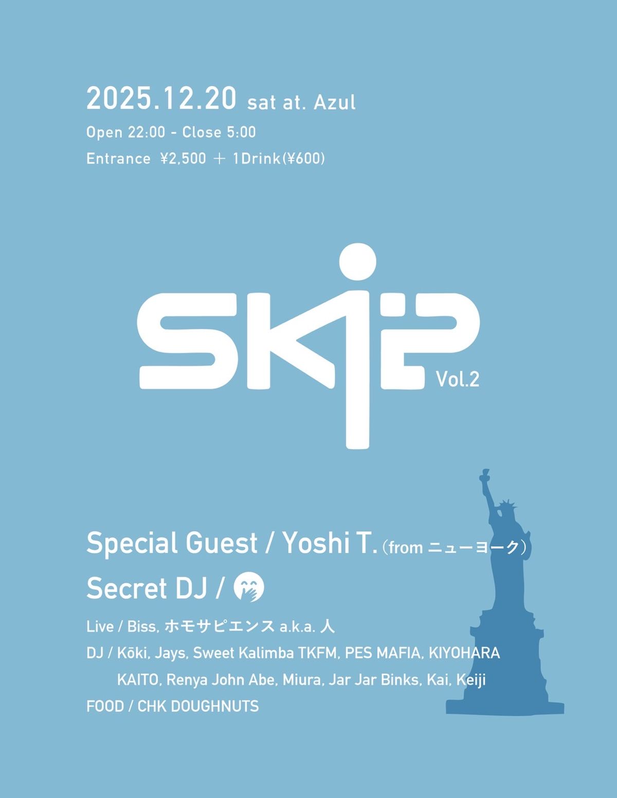 今年2月に初開催し話題となった【SKIP】待望の第2弾。今回も会場となる『Azul』のラウンジとフロアを活かし、音楽が持つ“多様性”と“可能性”を2つの空間でそれぞれ体感できる仕掛けに。今回は、NYC発の新鋭コレクティブWHATMOREとしてCoachella出演も控える、日系アメリカ人ラッパーYoshi T.がゲスト出演!揺るぎないヒップホップマナーと抜群のフックセンスでNYCと日本をつなぐ彼が、大分で見られる貴重な夜に。さらにもう1人シークレットDJも参戦決定。ローカルプレイヤーは、信頼と実績の面々がそろい、プレイヤー自身も楽しむ気満々。「ちょっとお腹空いたな」というタイミングに『CHK DOUGHNUTS』の嬉しいドーナツタイムも!?