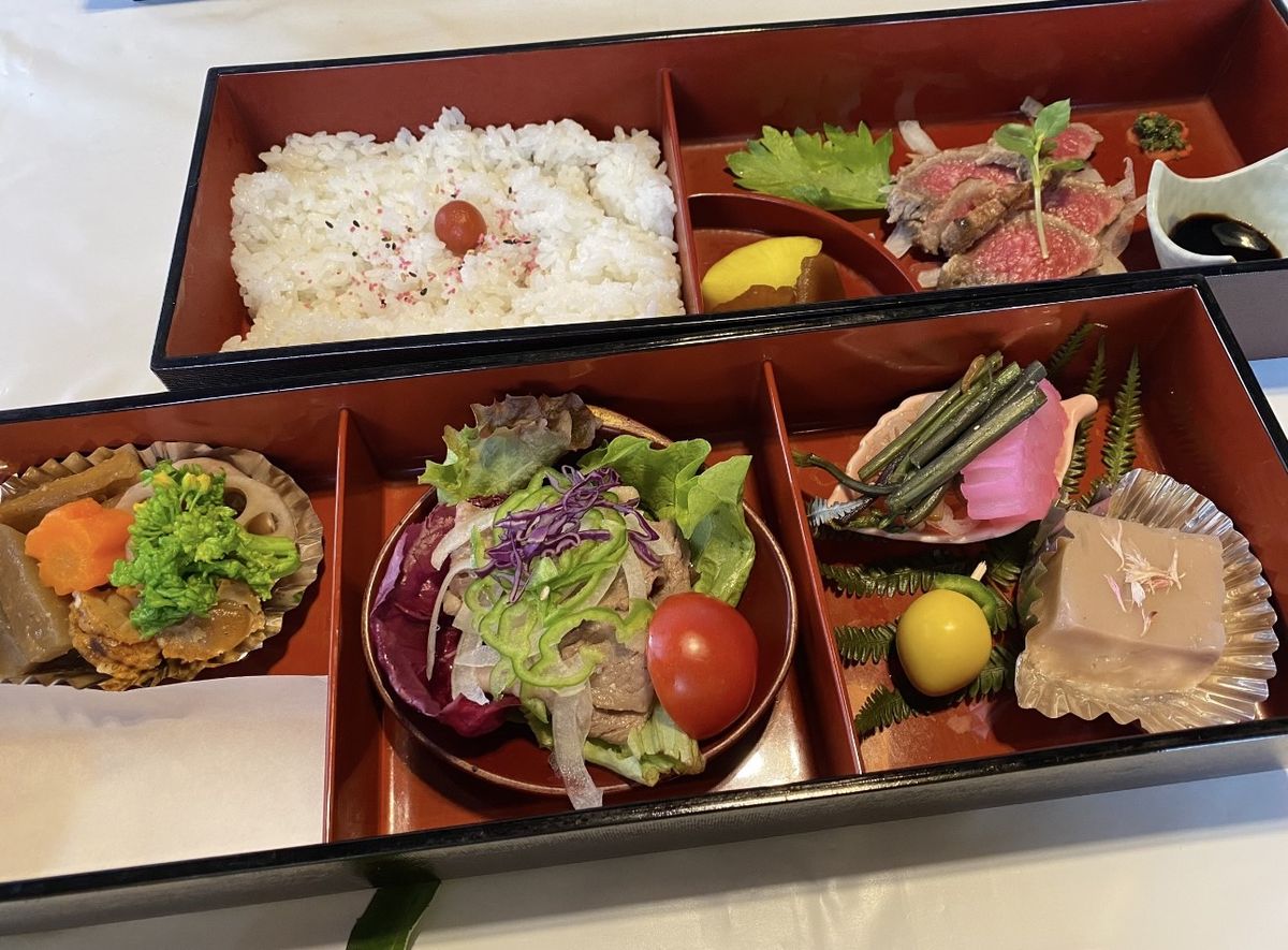 「季節のお弁当」2000円。大人気の豊後牛サラダ、お米はもちろん、玖珠米!