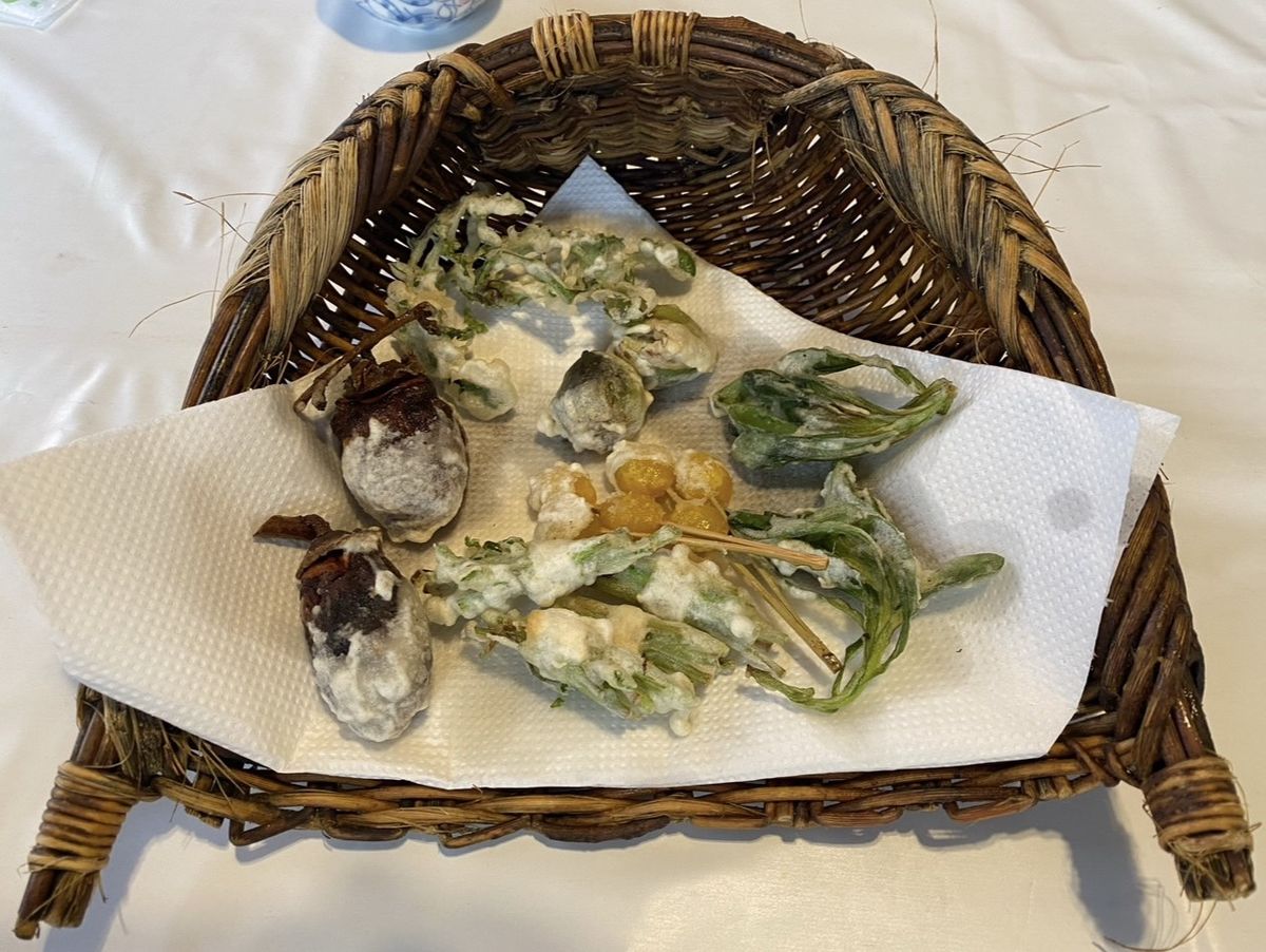 左の「干し柿の天ぷら」は中にチーズが入っています。干し柿のほのかな甘みとチーズがあう!
