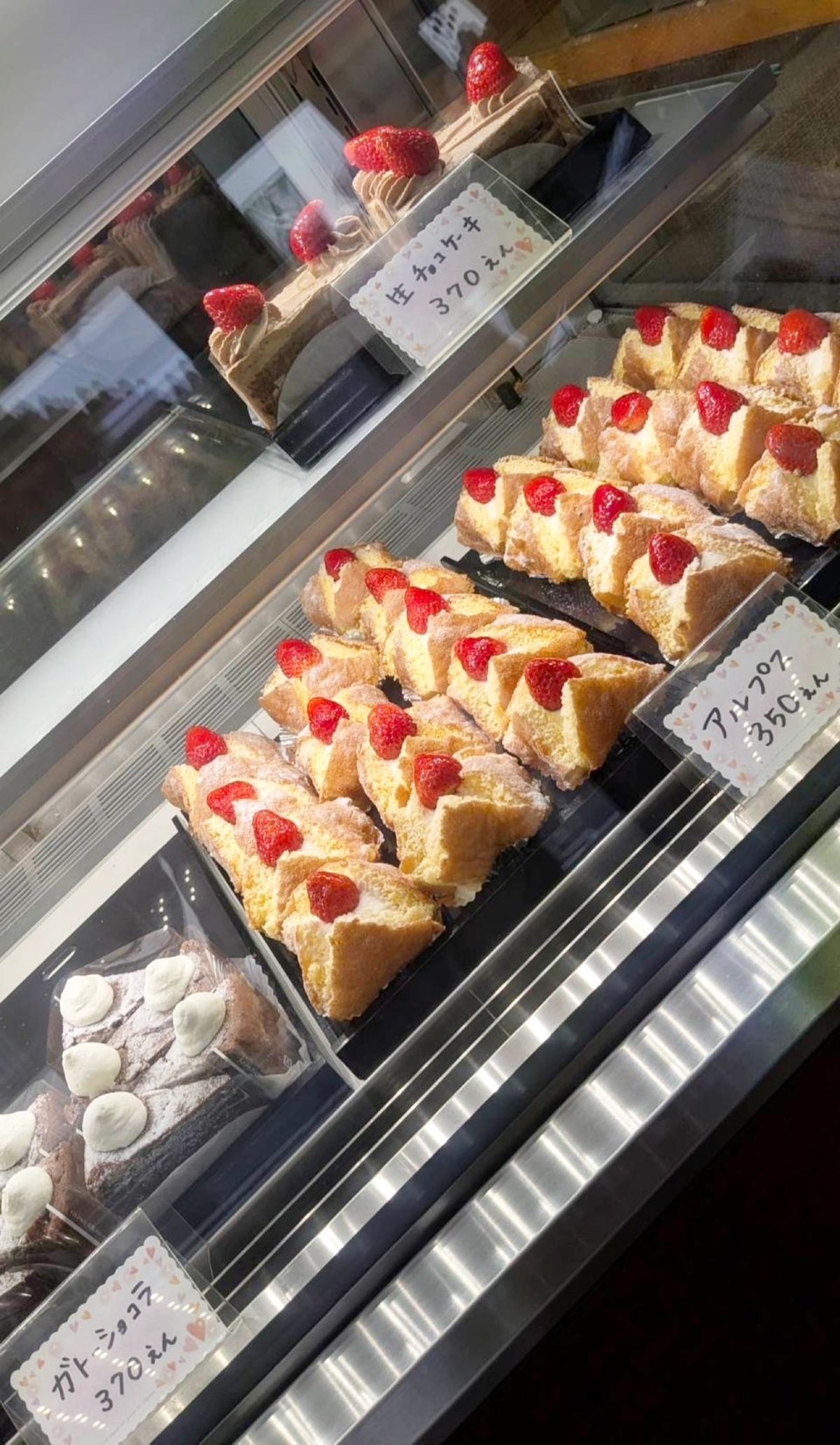 ケーキのいちばん人気はこちら!「アルプス」350円。スポンジケーキに生クリームがたっぷり!そして、その他のケーキもリーズナブルで大人気。ケーキは火・木曜のみの限定販売なのでお気をつけください♡