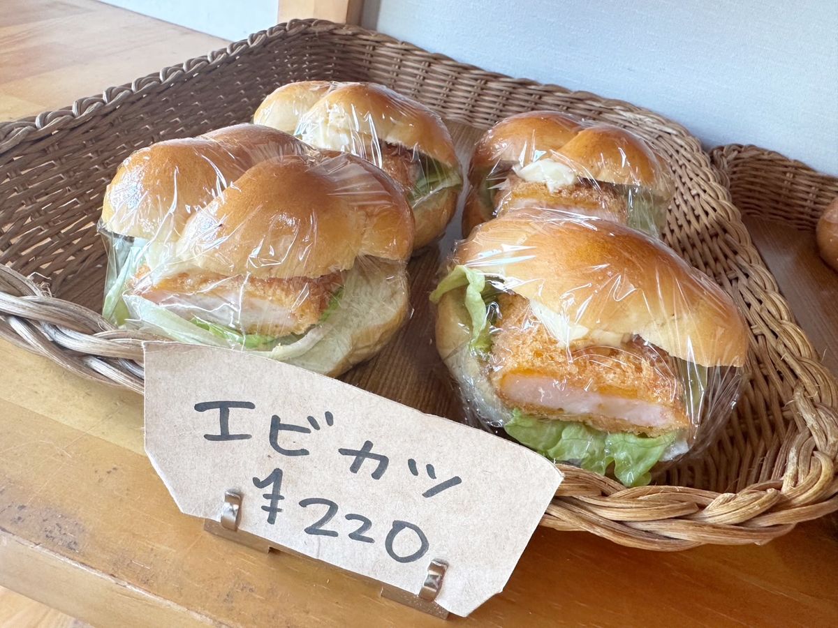 「エビカツ」220円。食べ応えのあるバーガーもこの価格!その他、メロンパン・ジャムパンはなんと100円!その他の菓子パン・総菜パンも120円~お買い求めいただけます!