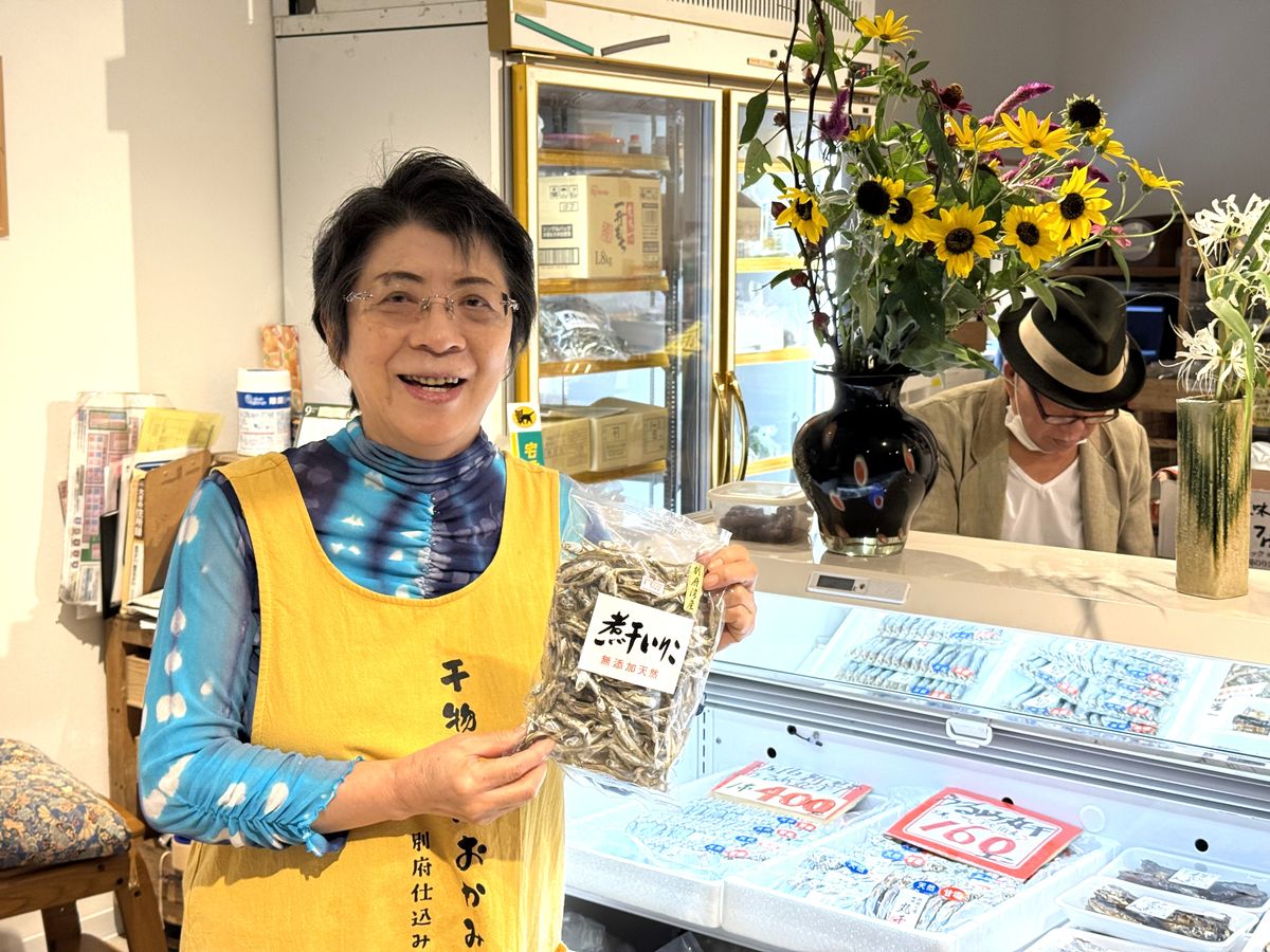 「新鮮なお魚や干物をお土産にどうぞ!」と名物女将・高橋磨由美さん