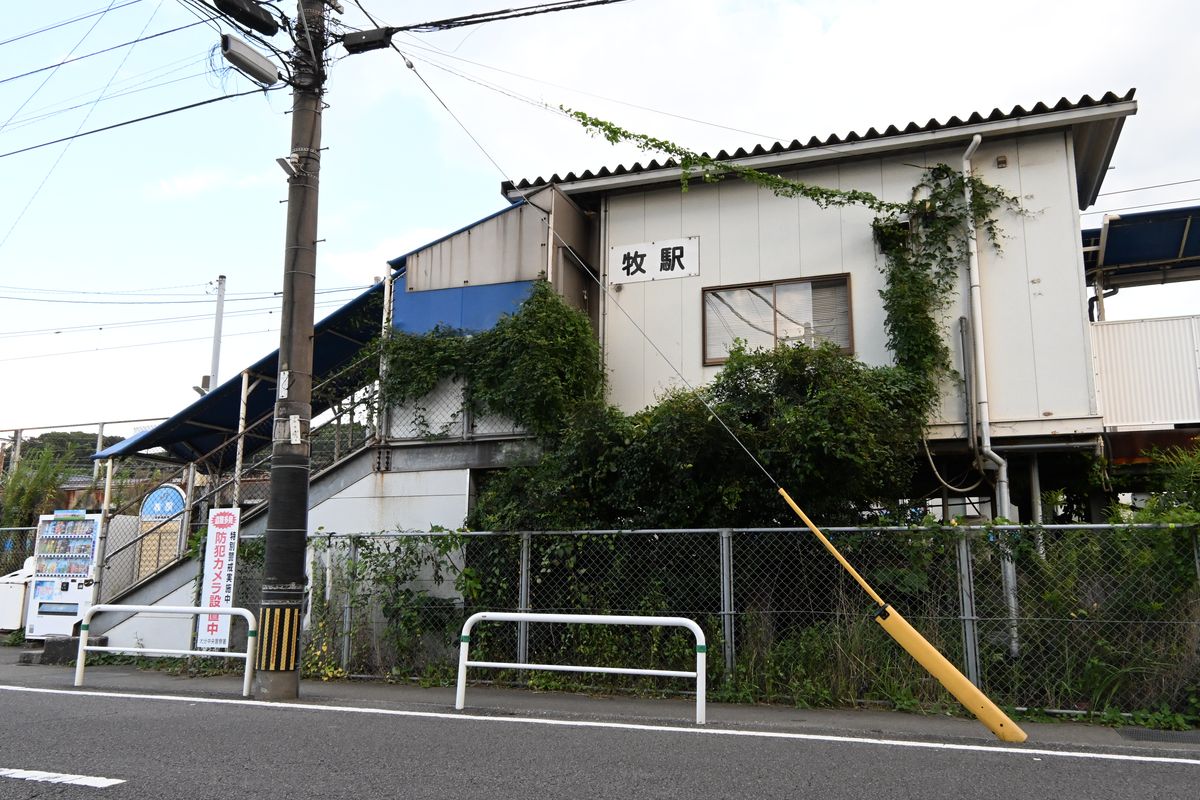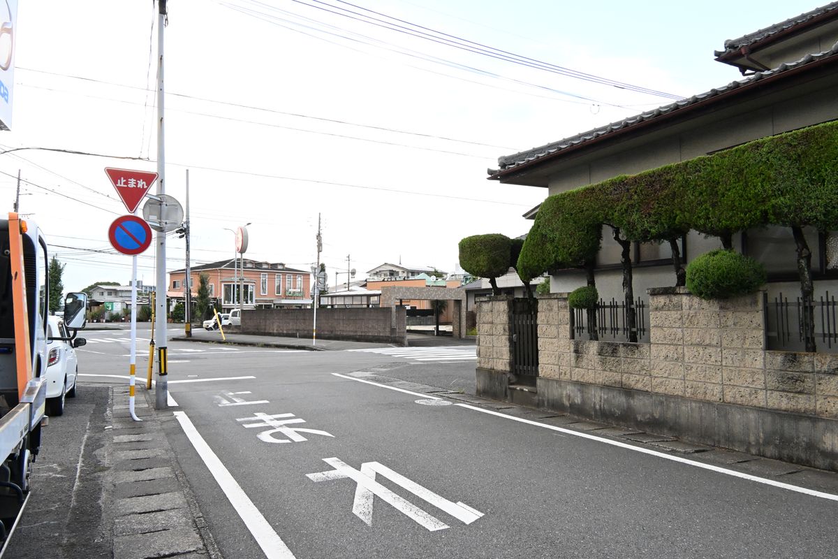 駅を背にして大通りの県道685号方面へ進みます。「牧西児童公園」を通り過ぎ、一時停止の道路標識を右に曲がります。しばらく進むと、食事処や古着店が軒を連ねる建物が見えてきます。目的地はその建物の奥。