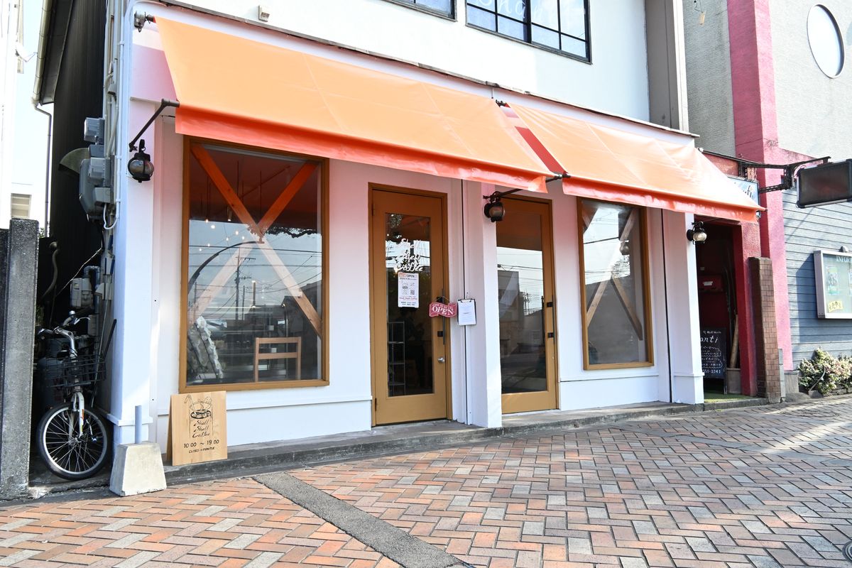 駅を出てロータリーに沿うように左手へと進み、国道197号に向かう石畳の道沿いにオレンジ色のテント屋根の建物が見えてきます。ちょうど1カ月前の11月15日にオープンしたばかりの『Shell Shell Coffee(シェルシェルコーヒー)』が今回の目的地。徒歩1分ほどと過去“徒歩旅”の中でも1,2を争う駅近スポットです。