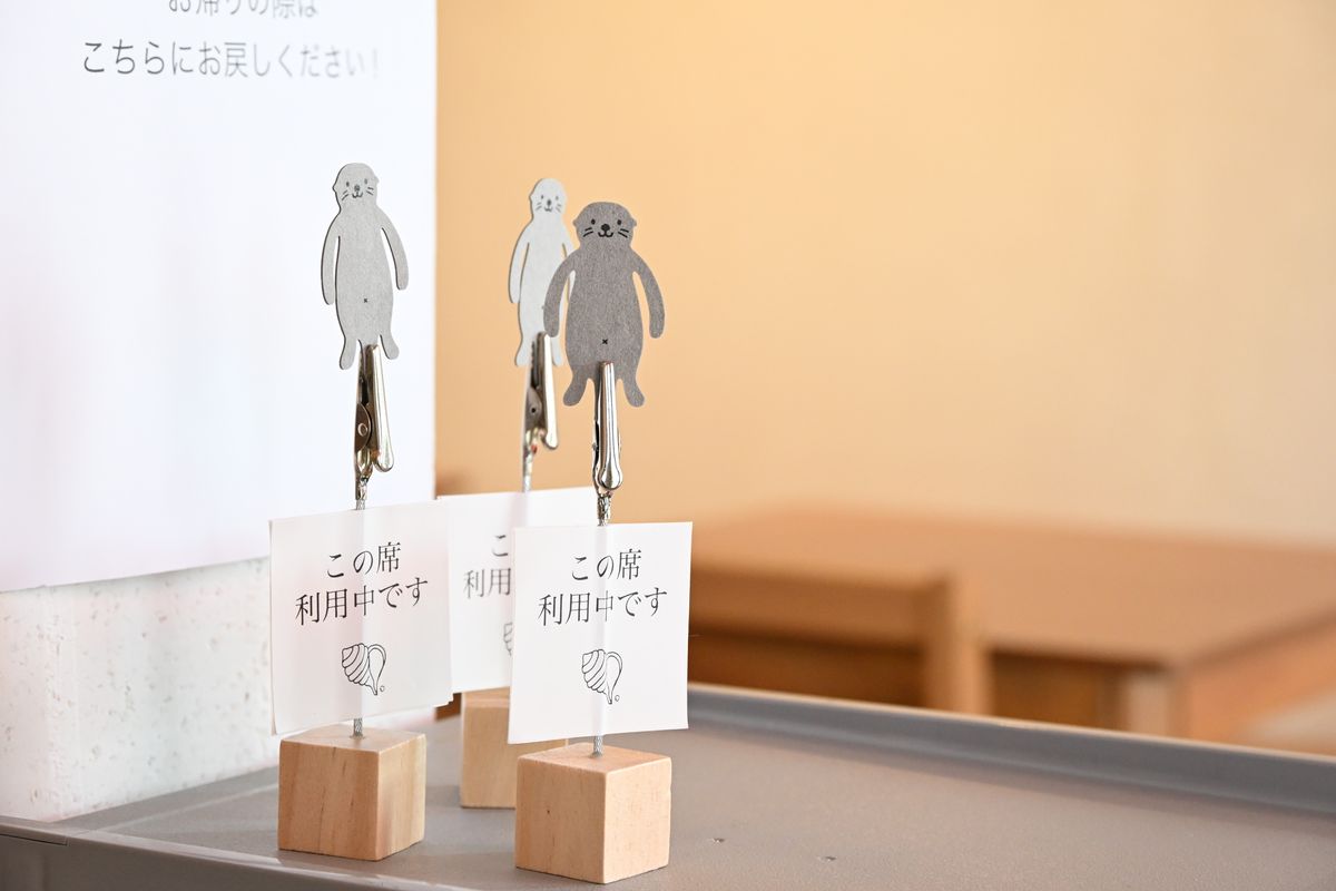 焼き菓子でひと際目をひいたのが、こちらのラッコモチーフのスコーン。ほんのりと甘い黒糖がアクセントで、コーヒーはもちろんラテとの相性もバツグン。ちょっと甘いものが食べたいときにちょうどいいサイズです。さて、スコーンの横にはラッコのぬいぐるみ(撮影のためにお借りしたので、もちろん添えて提供するわけではありません)。辺りを見渡すと…。