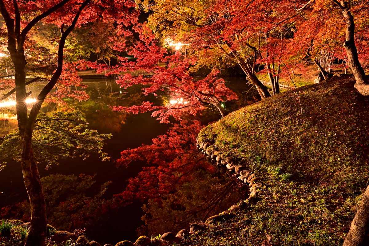 毎年、多くの見物客が訪れる『用作公園』は、約500本のモミジやカエデが埋めつくし、池に映り込む美しい紅葉も楽しめる秋の名所。期間中は、日没から21時までライトアップが行われるほか、15日(土)には池の上の特設舞台で勇壮な夜神楽「水鏡」も開催される。