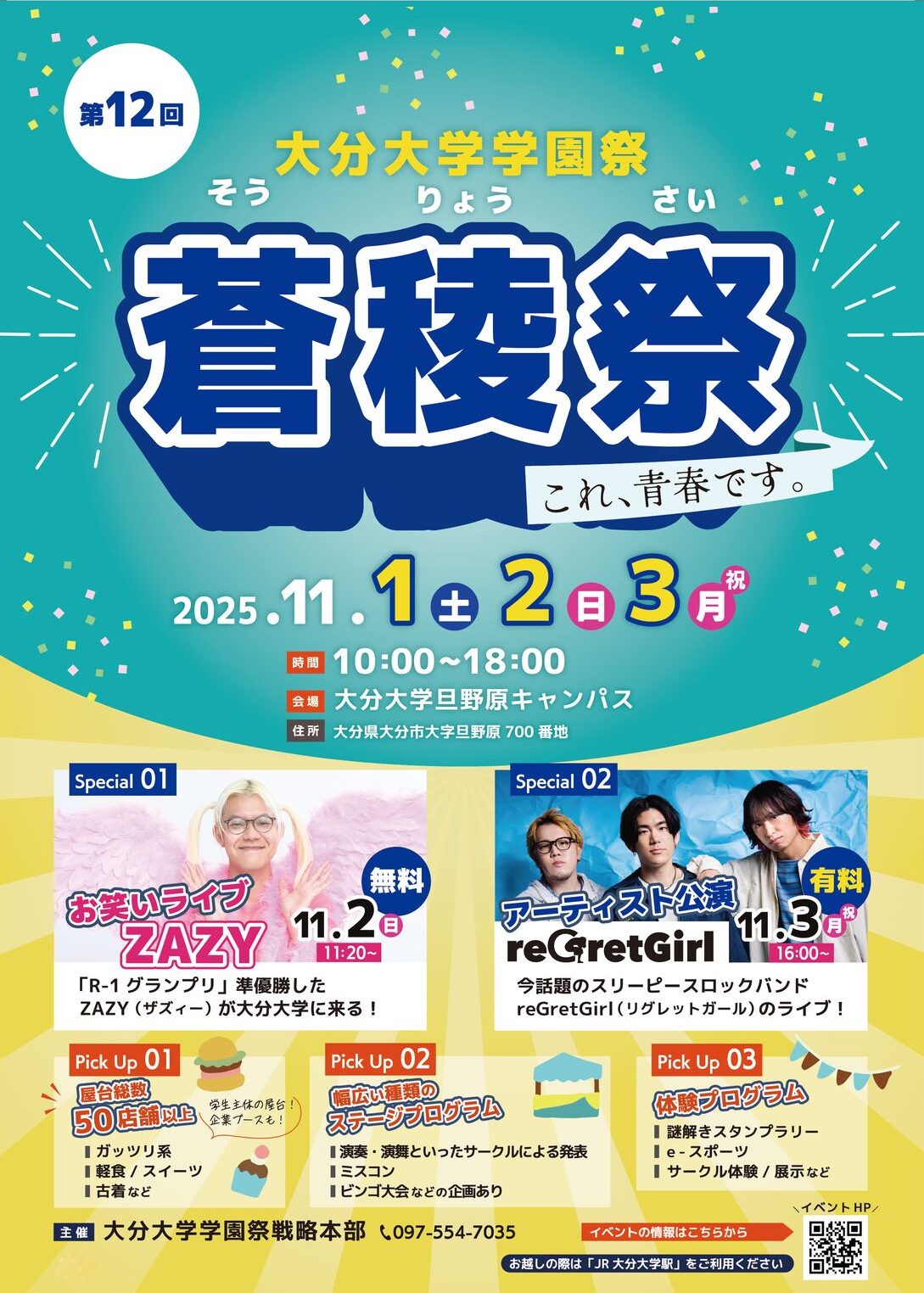 今年で12回目となる学園祭。等身大の歌詞とエモーショナルなサウンドで多くの支持を集める「reGretGirl」のステージや、ZAZYのお笑いライブ、ミスコン、謎解きゲームなどのイベントや、学生屋台・キッチンカーなども登場する。