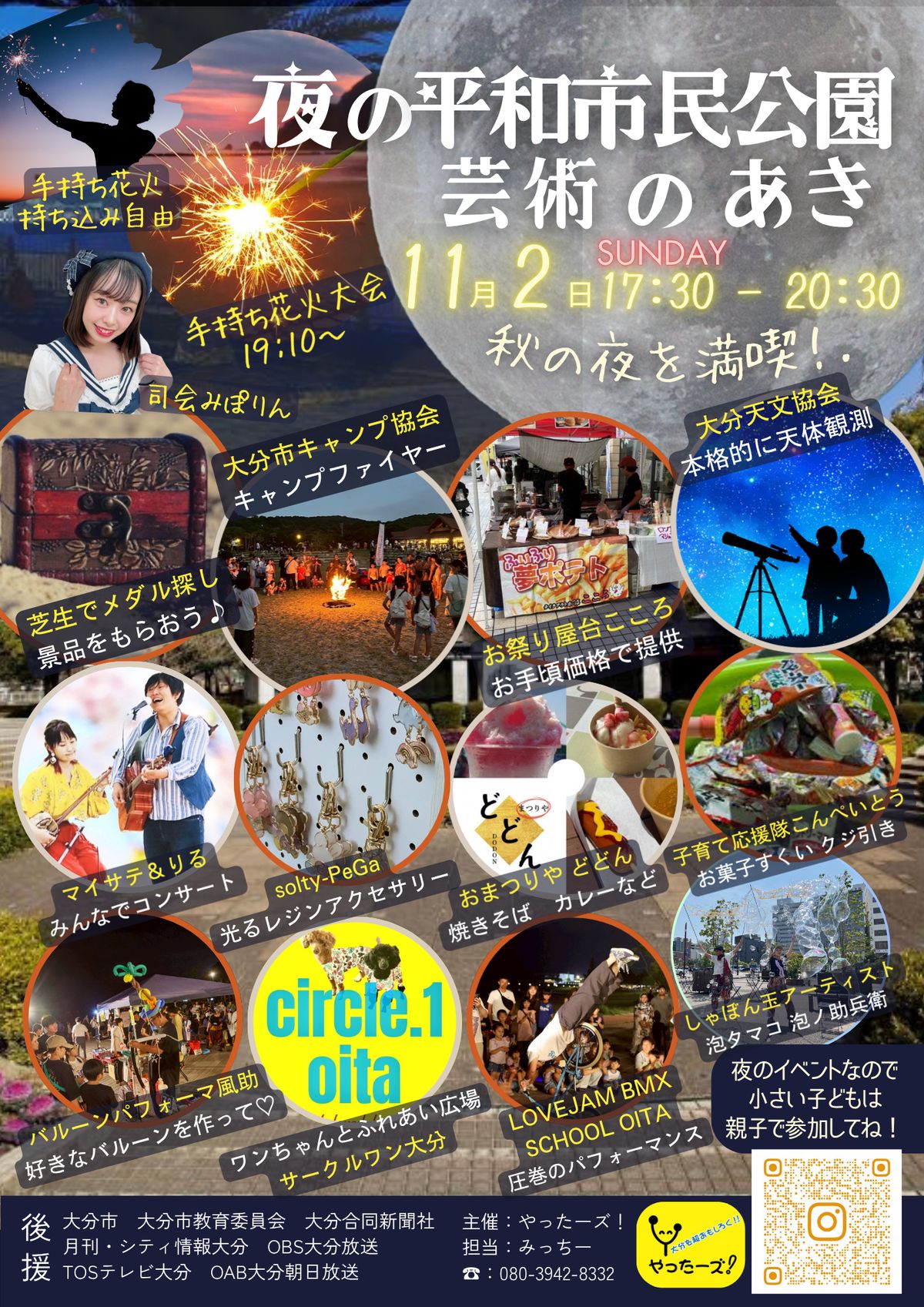 平和市民公園で入場無料の夜イベント開催!キャンプファイヤーや本格的な天文観測、焼きマシュマロ、花火大会、バルーン・自転車・しゃぼん玉パフォーマンスなど、楽しめる内容が盛りだくさん。屋台や音楽ライブ、ワンちゃん交流会もあり!三連休の夜を公園で秋を満喫してみて。