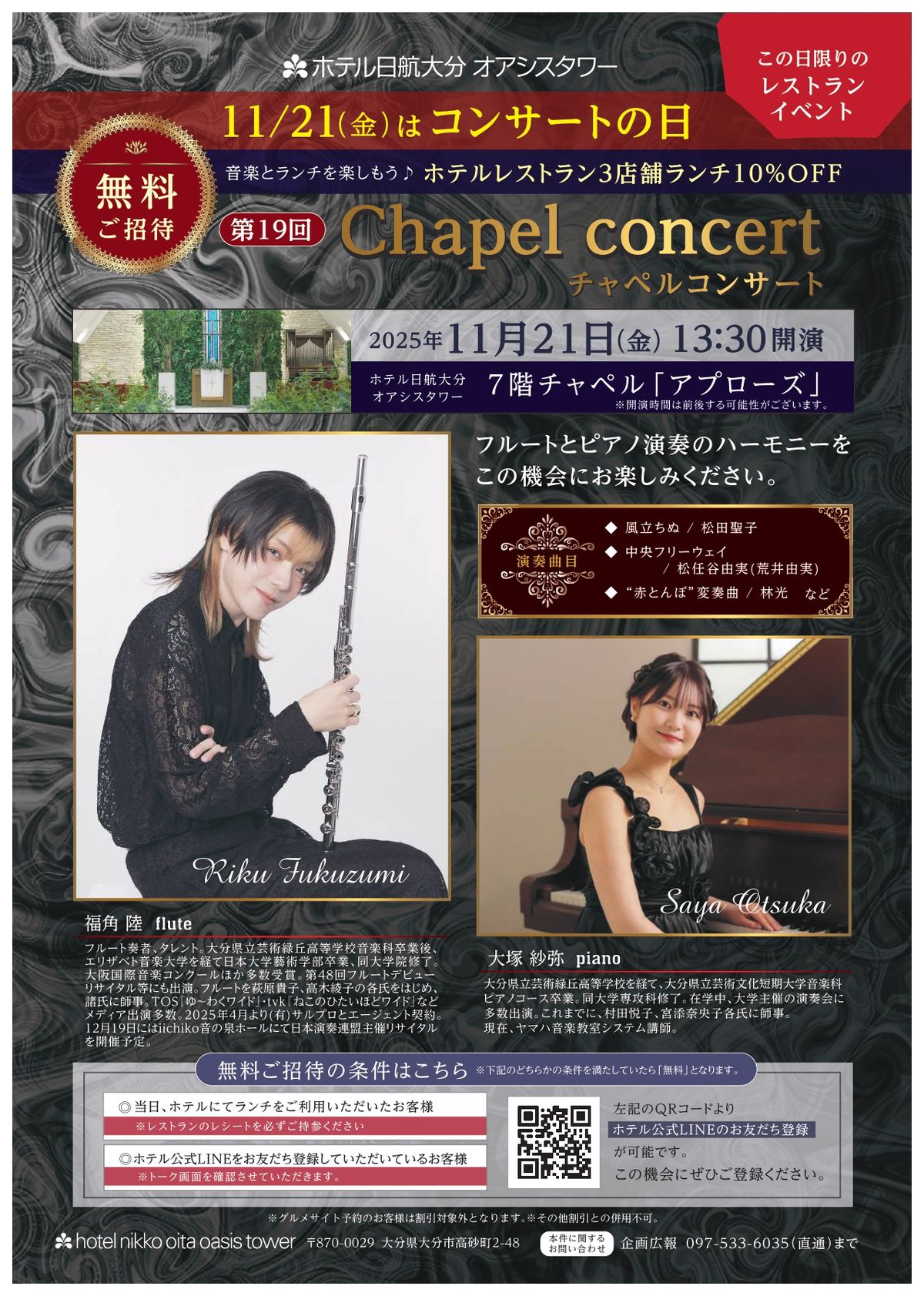 『ホテル日航大分オアシスタワー』で恒例のチャペルコンサートが開催。当日ホテルでのランチ利用者、もしくは公式LINEの友達登録をしてくれた人限定で、コンサートに無料招待する。また、当日は館内のレストランのランチ料金が10%オフ!今回は、タレントとしても活躍するフルート奏者福角陸と音楽講師として活動するピアニスト大塚紗弥が出演します。
