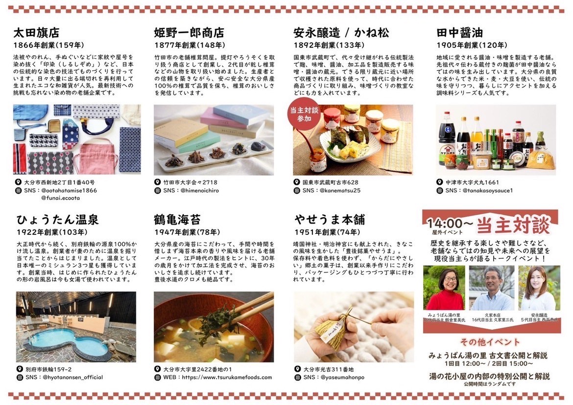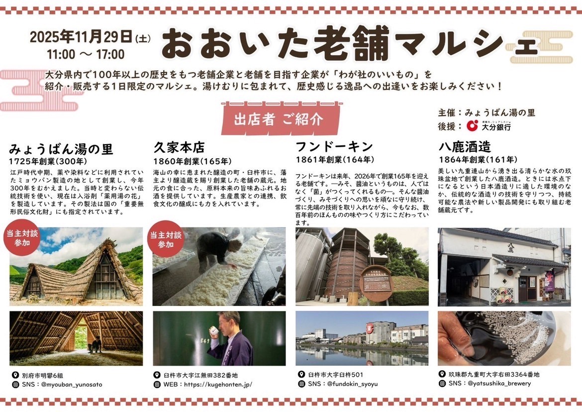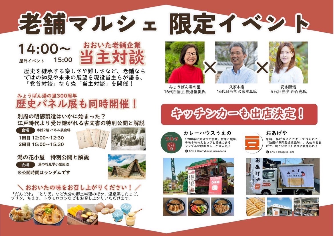 県内で100年以上の歴史をもつ老舗企業が集まる「おおいた老舗マルシェ」。伝統や歴史を受け継ぐ企業が出店し、こだわりの商品を販売します。会場では、『みょうばん湯の里』『久家本店』『安永醸造』の当主によるトークイベント「当主対談」や、『みょうばん湯の里』創業300周年を記念した歴史パネル展も開催。さらに、人気キッチンカー「カレーハウスうえの」「おあげや」も登場し、おおいたならではのグルメも満喫できます。老舗の魅力と大分の文化を体感できる特別な一日をお楽しみに。