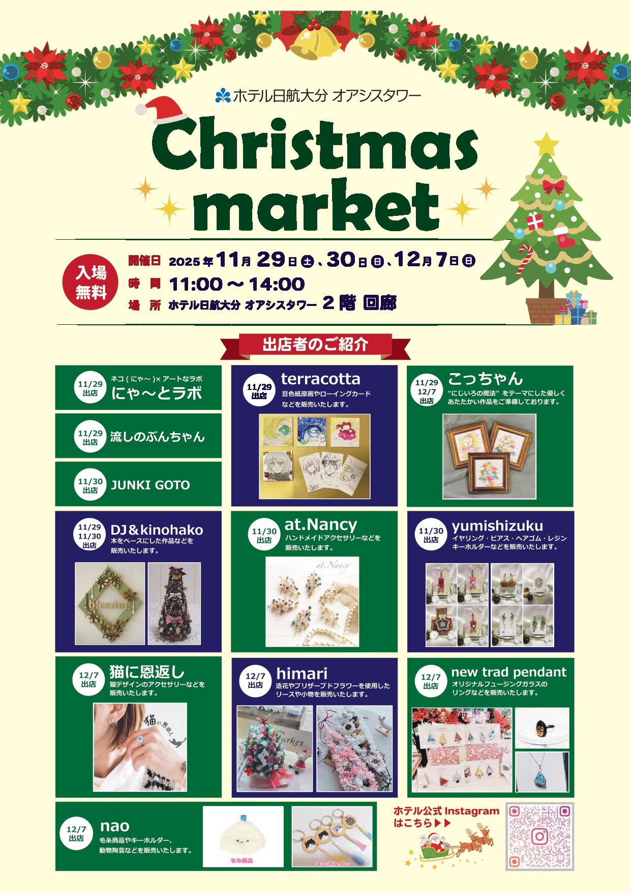 『ホテル日航大分 オアシスタワー』2Fの回廊が、期間限定でクリスマスマーケットに変身!アクセサリーや小物、可愛いハンドメイドグッズが並び、見ているだけでもワクワクする空間に。11月21日(金)~12月19日(金)の期間中は、ホテル内でランチビュッフェ「クリスマスアドベント」も開催!お腹も心も満たされる、ちょっと特別な冬のひとときを過ごしてみませんか?