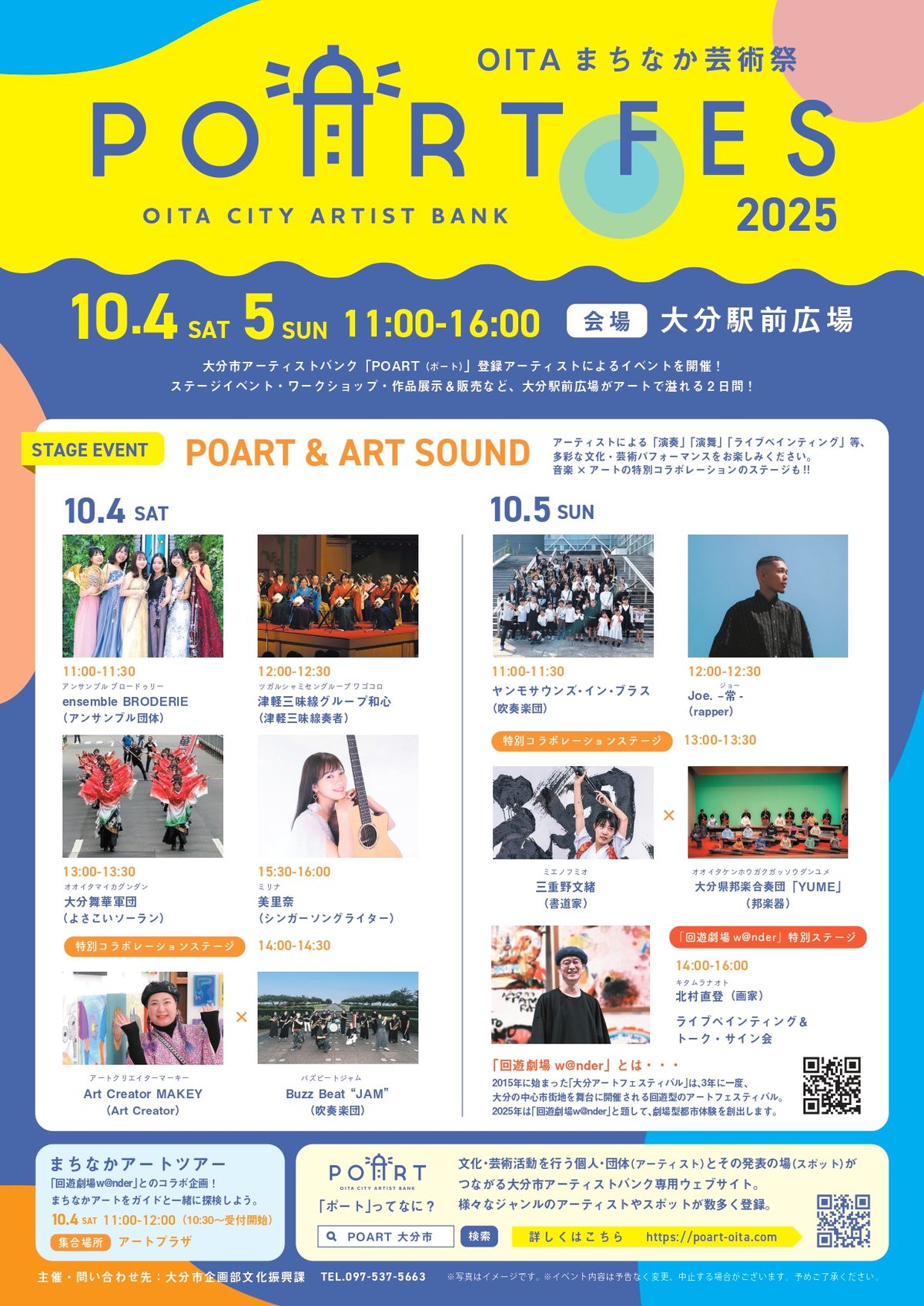 大分市アーティストバンク専用WEBサイト「POART(ポート)」に登録されているアーティストによるパフォーマンスやワークショップ、作品展示・販売などを行うイベントを開催。演奏や演舞、ライブペインティングといった、多彩な文化・芸術のパフォーマンスをはじめ、「音楽×アート」の特別コラボなど、催し盛りだくさんで実施される。