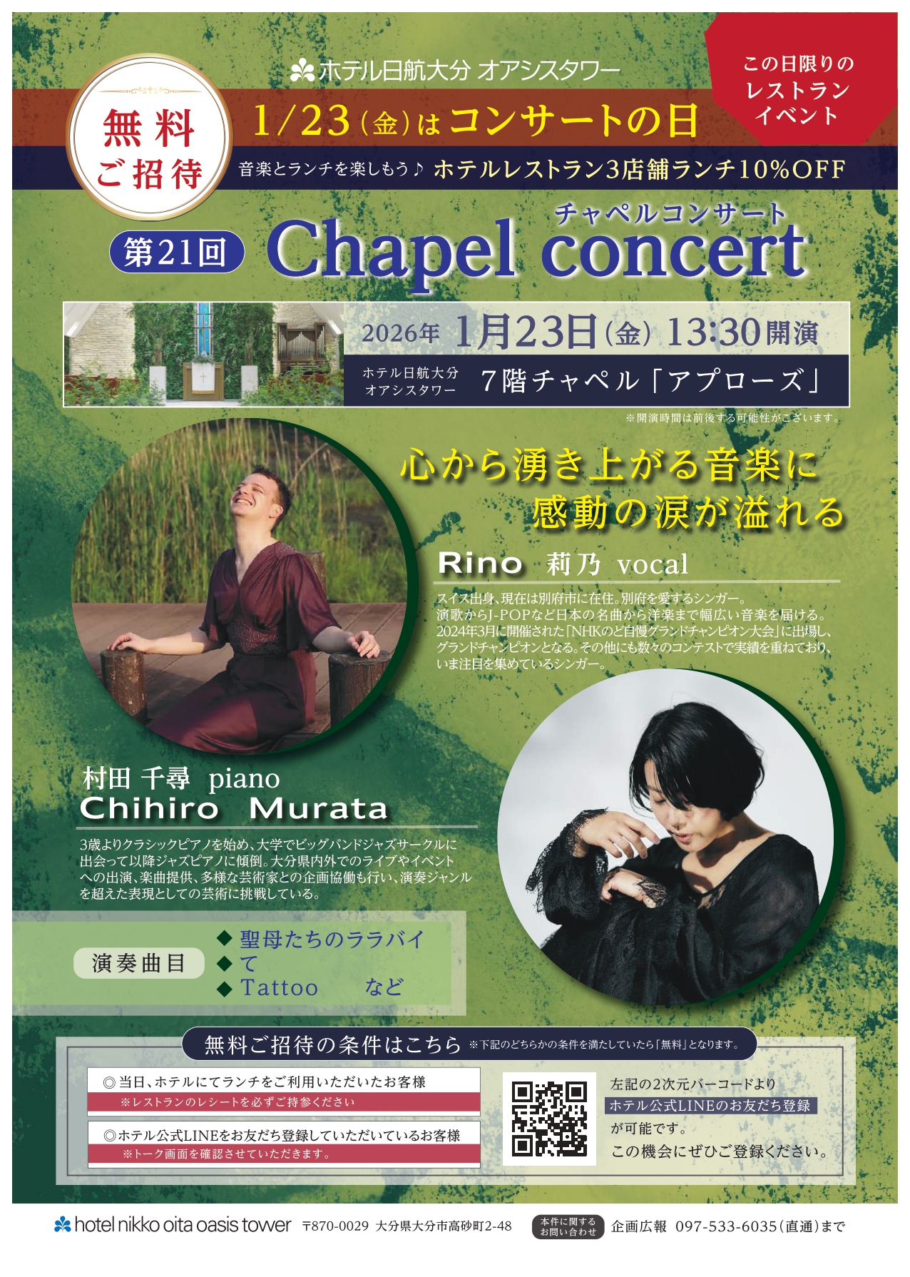 『ホテル日航大分オアシスタワー』で恒例のチャペルコンサートが開催。当日ホテルでのランチ利用者、もしくは公式LINEの友達登録をしてくれた人限定で、コンサートに無料招待する。また、当日は館内のレストランのランチ料金が10%オフ!今回は「NHKのど自慢グランドチャンピオン大会」のグランドチャンピオンのシンガー莉乃と、第13回、第16回のチャペルコンサートでも圧巻の演奏を魅せたジャズピアニストの村田千尋が出演。「Tattoo」や「聖母たちのララバイ」などを演奏します。2人が紡ぐ心から湧き上がる音楽をぜひご覧ください。