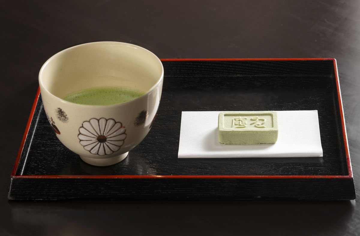 江戸時代の享保(きょうほう)年間に創業した『とまや』は、280年以上お茶一筋。城下町の景観を今に伝える伝統的な町家形式の店内では、抹茶や煎茶のお点前(てまえ)の体験や、喫茶メニューを楽しめます。お茶に添えられた落雁(らくがん)『豊生(ほうせい)』は、お店で手作り。昔ながらのシンプルな素材と製法で、今でも1つ1つ型抜きしています。良質な抹茶を混ぜ込んだ薄緑色の落雁は、上品な甘さ。一杯ごとに点ててくれるアツアツのお抹茶や丁寧に淹れてくれる煎茶の味わいを、さらに引き立ててくれます。