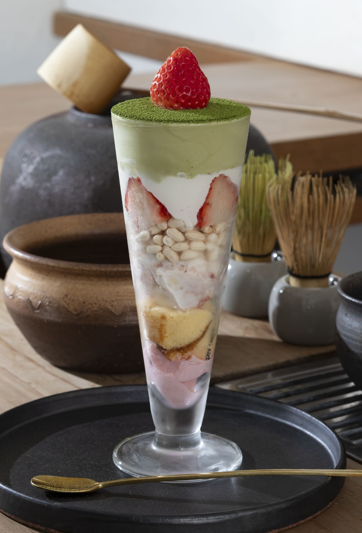見た目も華やかな「お茶屋さんのパフェ」は季節ごとに内容が変わり、春は「八女抹茶といちご」1300円(期間限定※提供の期間は事前確認を)