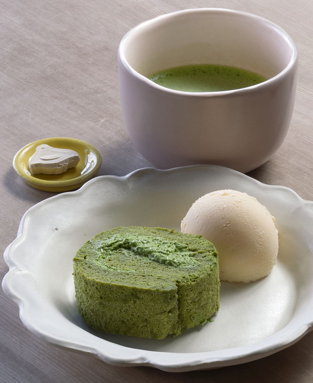 温かい抹茶を合わせた「抹茶ロールケーキセット(バニラアイス添え)」950円。どのメニューにも添えられた和三盆の干菓子も、お店のオリジナル。『丹羽茶舗』で購入することもできます