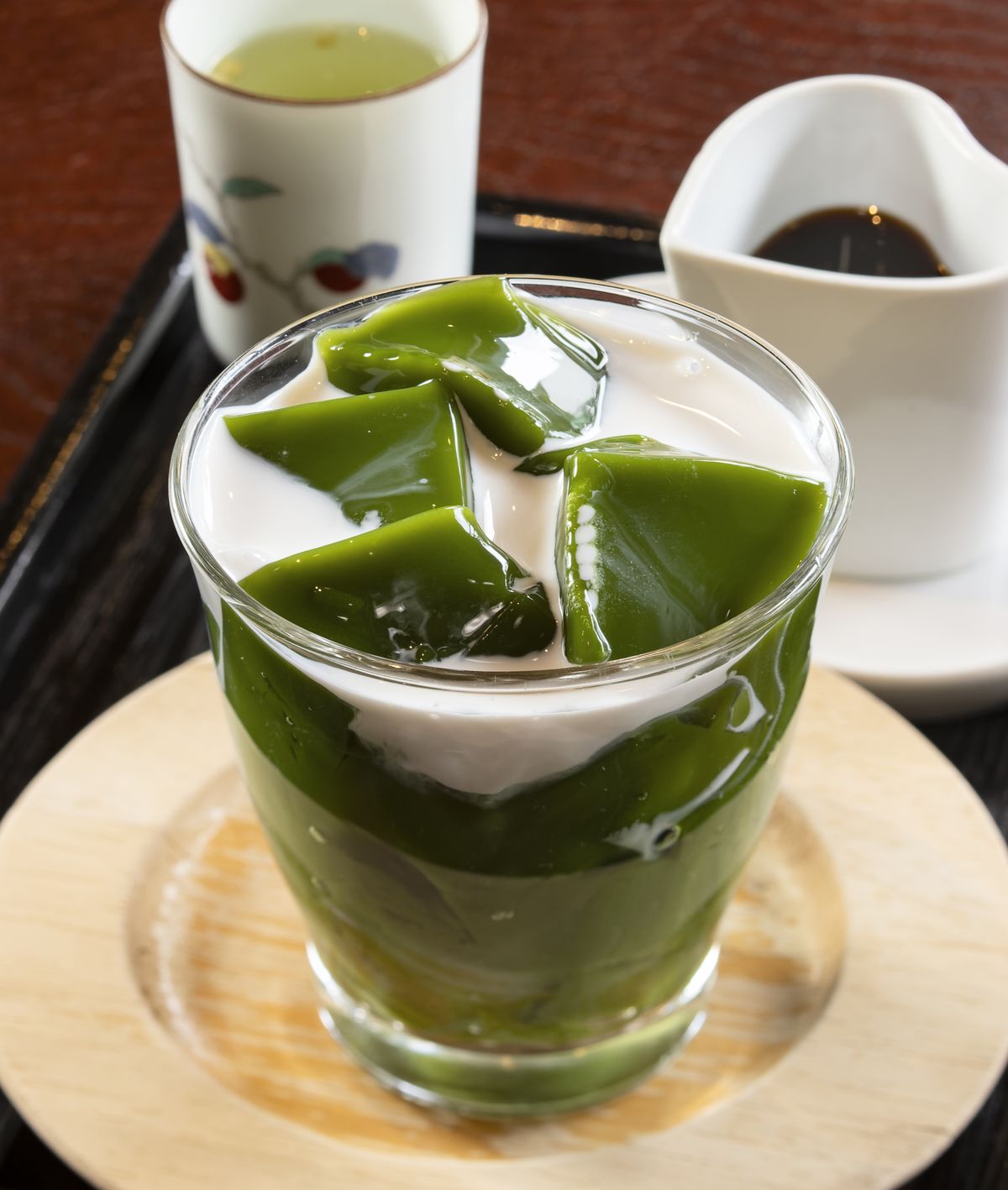 宇治抹茶を贅沢に使った「抹茶ゼリー」700円(梅昆布茶付き)。濃厚なゼリーはまずはミルクのみで、お好みで黒蜜をかけていただきましょう