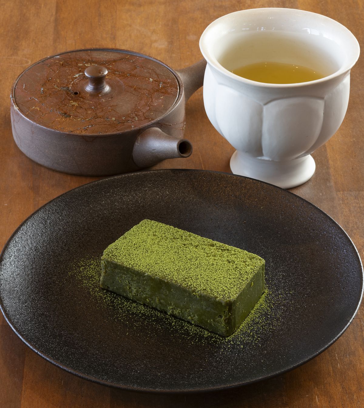 抹茶をリッチな味わいで楽しめる「抹茶テリーヌ」600円。おしゃれな茶器で淹れてくれる「玉緑茶吉四六の里」620円(和菓子付きは720円)は、臼杵焼きの器で召し上がれ