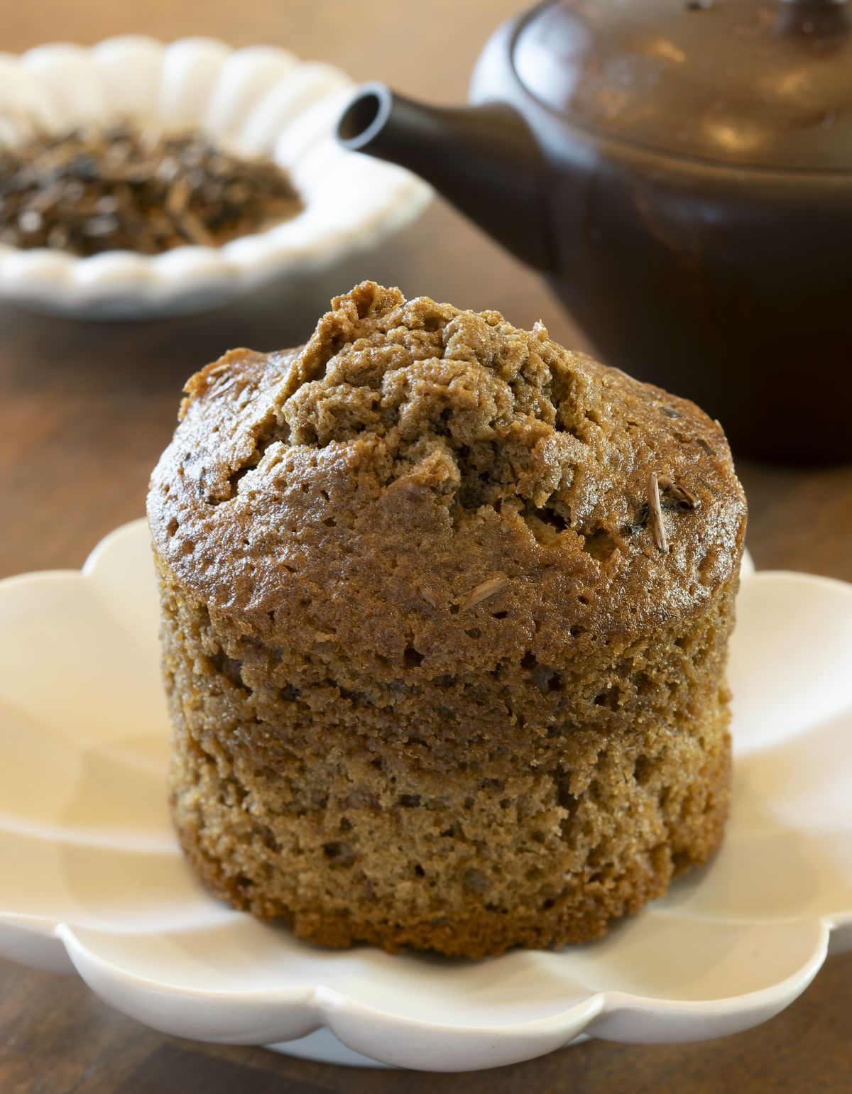 ほうじ茶の茶葉をトッピングした「ほうじ茶マフィン」400円は、ほうじ茶ならではの香ばしい香りもたまりません