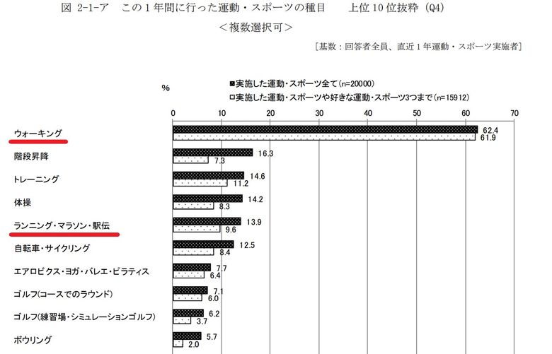 熱しやすく冷めやすい私たち。続くかどうかは神のみぞ知るですが、取りあえず始めてみるか…って時に、どんな運動に取り組む人が多いんでしょうか? これも統計データがあります。スポーツ庁すごい。