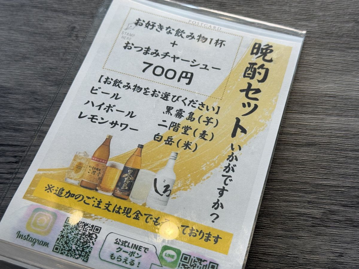ほかにも、チャーシューが主役の「チャーシューメン」1100円、高菜の旨みがご飯に染みる「チャーシュー高菜丼」350円、「明太子ご飯」350円など、サイドメニューも充実。夜は「晩酌セット」700円もあり、ラーメン店としてだけでなく、気軽に立ち寄れる一軒として使えるのも魅力です。