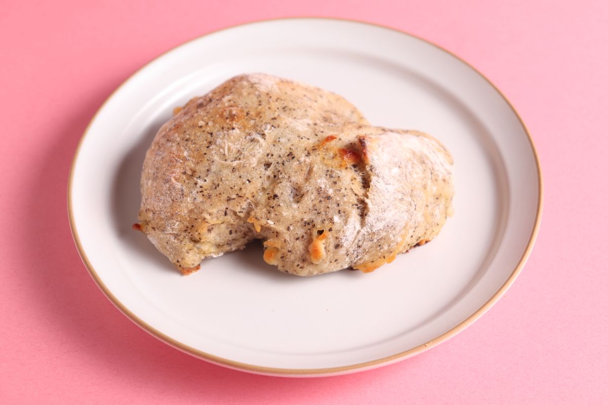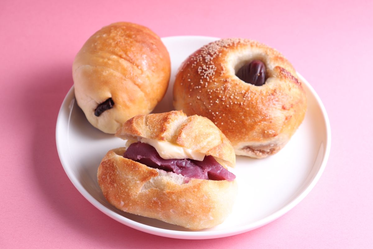 人気急上昇中なのが、イモや栗を使ったパンたち。沖縄県産紅芋をあんと、有塩よつ葉バターを、もっちりとしたフランスパンで挟んだ「紅いもあんバター」は、お客さんはもちろん、スタッフも太鼓判を押す一品。なめらかでやさしい甘さの紅芋あんとバター、食べ応えのあるフランスパンとのバランスが絶妙です!「栗ーむちーずベーグル」は、マロンペーストとよつ葉クリームチーズをまぜてフィリングして、20時間長時間発酵した生地で包んでゆでて、仕上げに栗の渋皮煮をのせて焼き上げたパン。むちっとした生地の中はしっかり詰まっており、食べ応えのある満足度が高いパンです。どちらも秋らしい見た目・味わいに買い求めるお客さんも多いのだとか。「塩チョコロール」は、ロールパンに棒チョコレートをまいてピンク岩塩をアクセントに。甘い×塩気のいいコンビです。