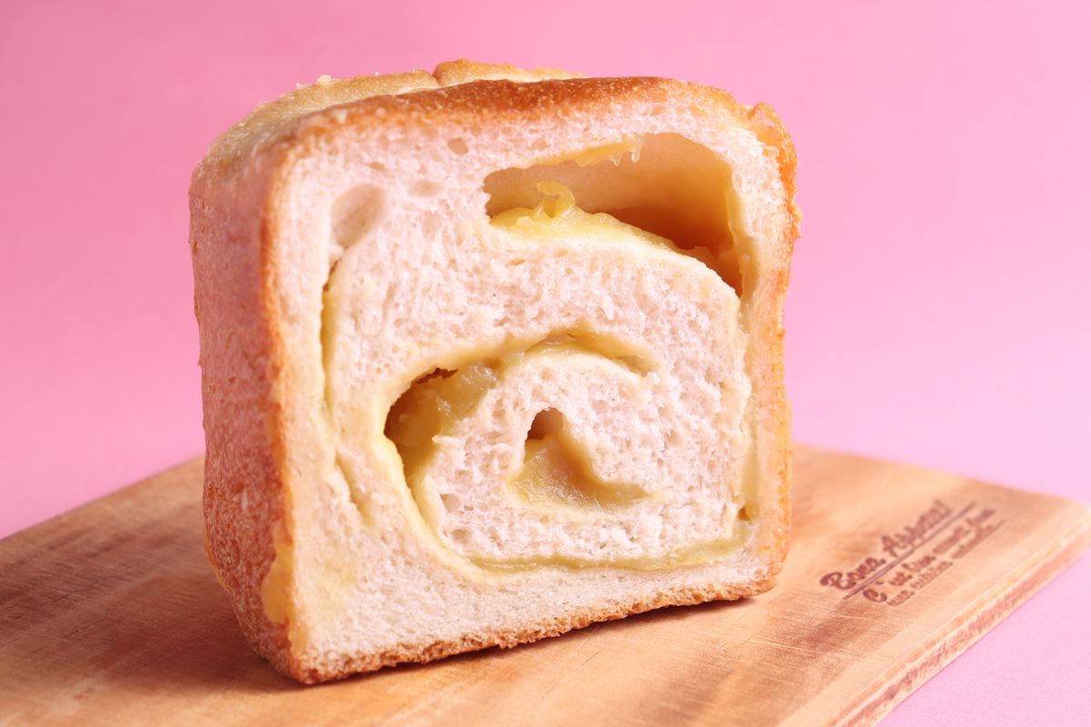 「スイートポテトあんのミニ食パン」も、ほのかな甘みの芋あんを練り込んだ人気商品。しかしこの1個の価格、やさしいお値段ですが本当にこの価格ですか?と何度も確認しましたが、「お客さまに喜んでもらいたくて、この価格に決めました!」と店主の桑原克次さんはにっこり笑います。
