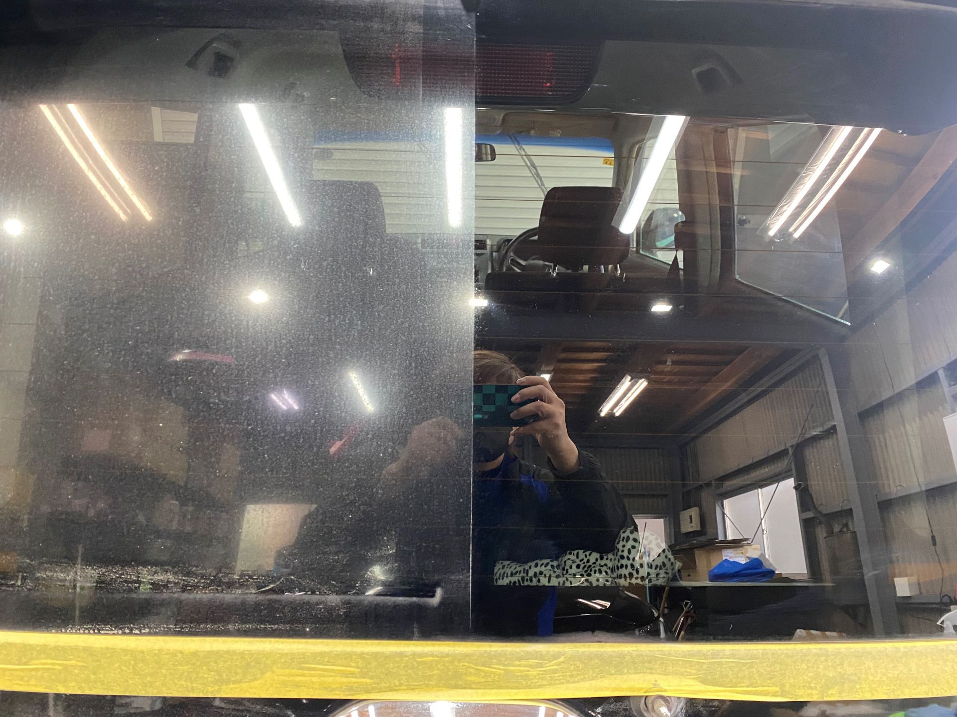 施工前(左半分)と施工後(右半分)では歴然の差。くもりのない鏡のような美しさ