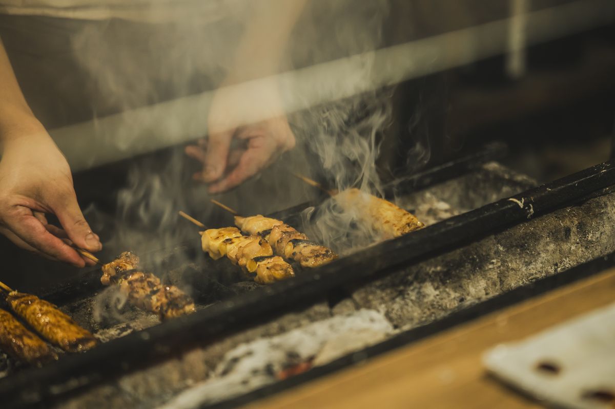 カウンターの前では、店主が黙々と串を焼いている。“煙を浴びながら一杯”がたまらない、1975年創業の鶏料理専門店。串は全7種類あり、「きも」や「つくね」、「もも(味噌だれ焼)」、「ささみ」、「かわ」各330円などが人気。