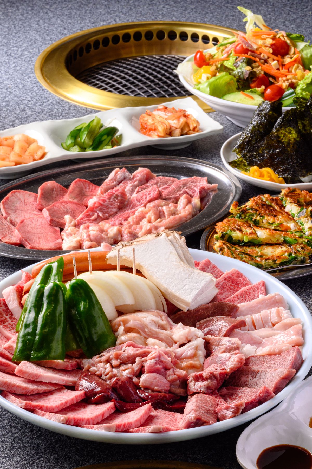 創業50年以上になる『第二食道園』。接待や家族のお祝い事にと予約注文される焼き肉のコースは、特上カルビや特上マクミ、特上ミノ、赤どりのせせり、イベリコ豚、ホルモンなどの部位の盛り合わせなど、満足度の高い内容。「テグタンスープ」もぜひオーダーして。