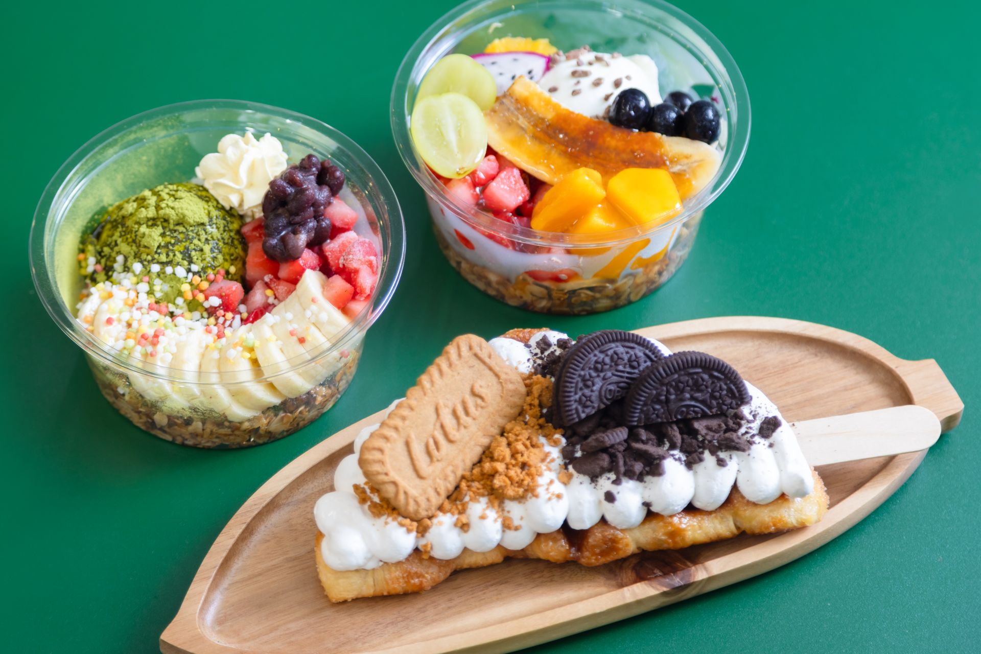 県産の成分無調整牛乳を使用し約2日かけて水切りした、濃厚で酸味の少ない手作りのグリークヨーグルト。店で焼き上げる風味豊かな自家製グラノーラとも好相性な人気メニューです。フルーツたっぷりの定番フレーバー6種に加え、新たに「抹茶ティラミス」880円が登場! 抹茶のほろ苦さと甘さ控えめなあんこが、ヨーグルトのクリーミーさを引き立てます。ほかクロッフルをはじめ、アサイーボウルやソフトクリーム、ドリンクまで豊富にそろい、新商品も続々。