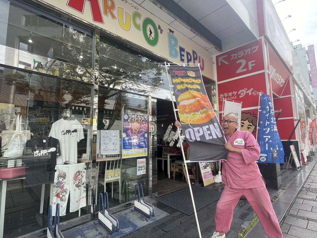 「別府の一休」花田さんの観光案内所『ARUCO DE BEPPU』内にオープンしたテイクアウト専門店。メンチカツとコロッケのいいとこどりをした「メンコロ」を使った「メンコロバーガー」を味わえる。食べ歩きにも最適!