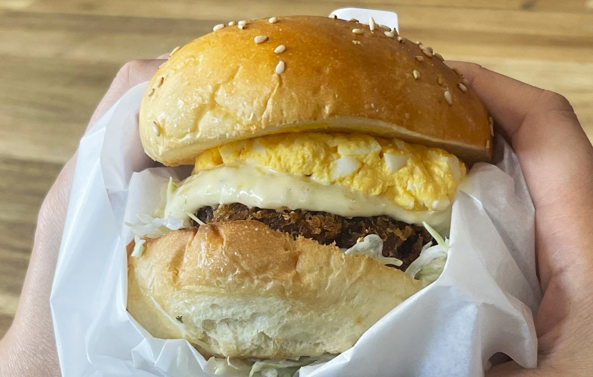「別府の一休」花田さんの観光案内所『ARUCO DE BEPPU』内にオープンしたテイクアウト専門店。メンチカツとコロッケのいいとこどりをした「メンコロ」を使った「メンコロバーガー」を味わえる。食べ歩きにも最適!