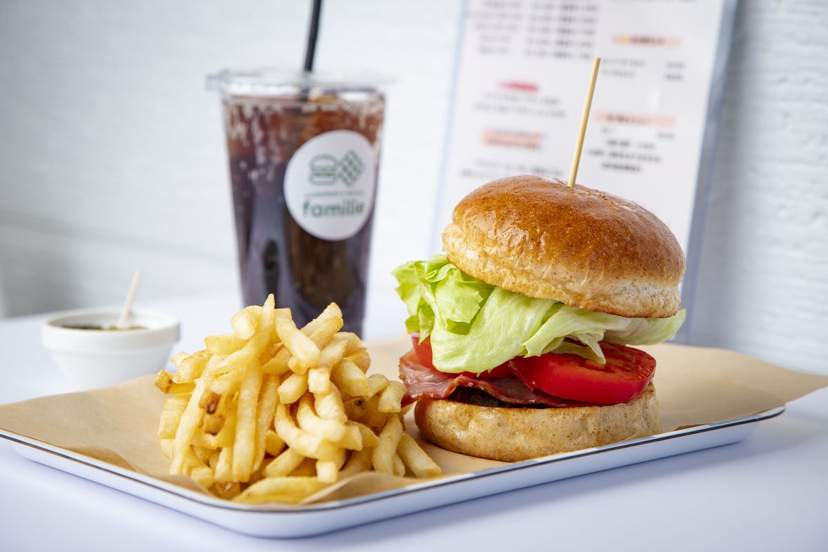子どもが遊べるスペースやオムツ替え台、キッズチェアまで完備した子ども連れ歓迎のバーガー店。「BLTバーガー」などボリューム満点のハンバーガーやアメリカンなワッフルがオススメ