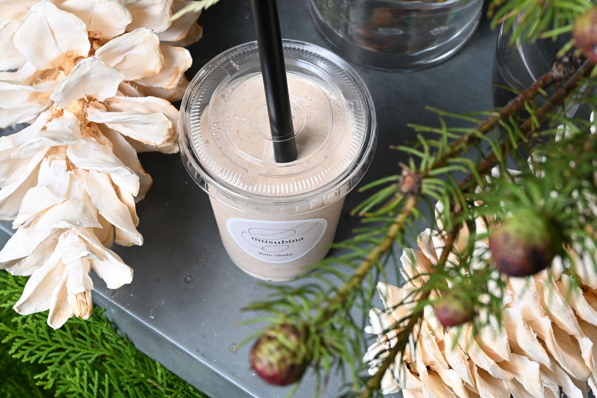 小さな花屋とデーツドリンクの店。万博でも人気を集めた「デーツシェイク」は、デーツ本来の甘さを生かしたやさしい味。ミルクやココア、チャイで作るホットもぜひ。