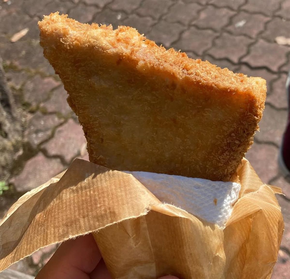 食べ歩きに良いサイズだが、大きめなのが嬉しい。まず猫にあげる前に味見。