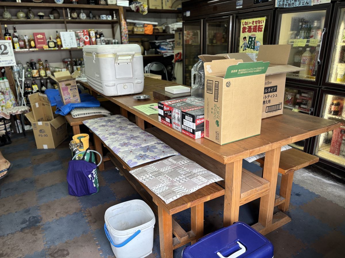 お母さんが「花火大会の準備で散らかってるけど…。」と笑いながら迎えてくれた。普段は近所の方がこのテーブルを囲んでお酒を楽しんでいるそう。