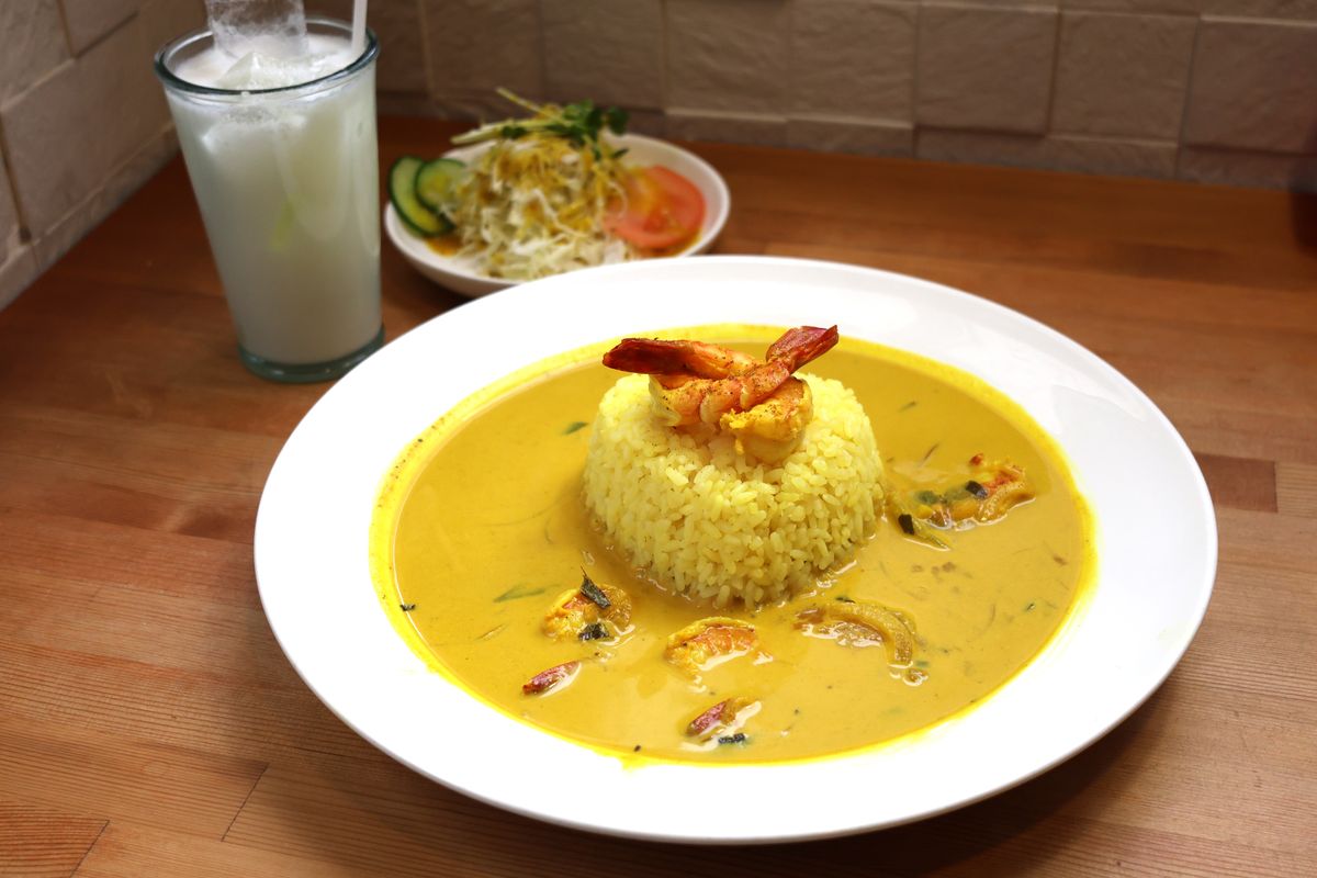 今回は特別メニューの「エビカリー」を注文しました!「エビカリー」はエビがプリプリ!ココナツミルクのサラサラとしたルウがご飯に染み込み、思わず唸ってしまうほど。スパイスの風味とトマトの酸味、ショウガのパンチが利いていてクセになるおいしさです。