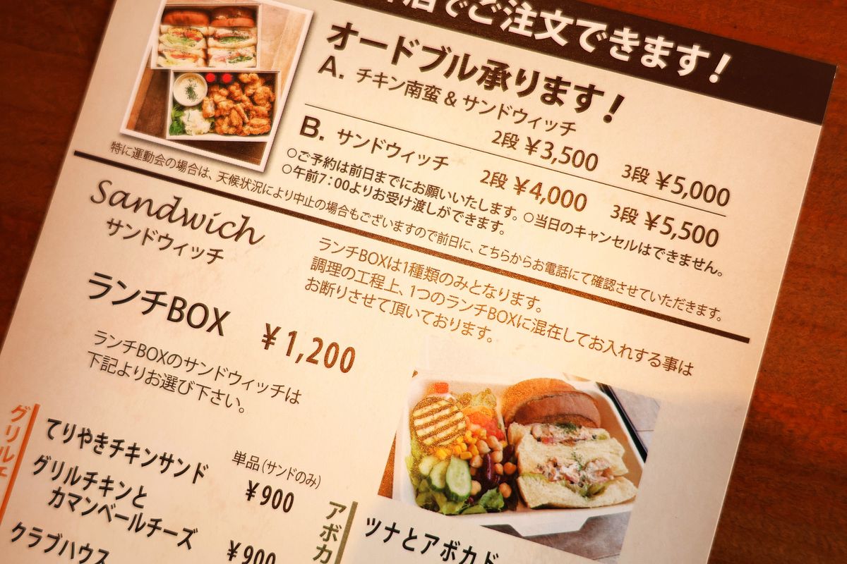 実は、オードブルやお弁当の注文も可能。チキン南蛮やサンドイッチのオードブルはボリューム満点! 行楽シーズンやお花見にもぴったりです。自宅での集まりやちょっとしたイベントにも重宝しそう。朝から午後まで通しで営業しているので、シーンに合わせて利用できるのも魅力です。