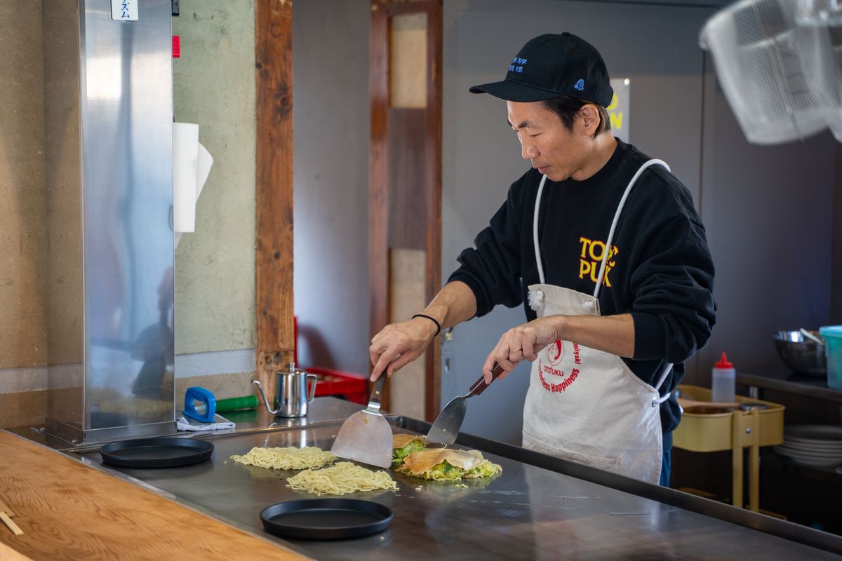 昼下がりの店内に、ソースの香りが広がります。カウンター越しに鉄板を眺めていると、不思議と時間の流れがゆっくりになります。慌ただしい日常から、ふっと気持ちが切り替わるような感覚です。この場所をつくったのが、三重野智裕さん。
