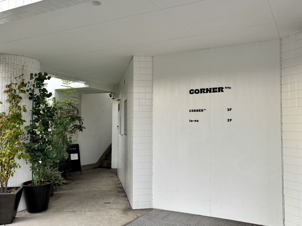 白い壁に書かれた社名『CORNER』の文字が目印。左奥の外階段から2階に進むと入り口があります