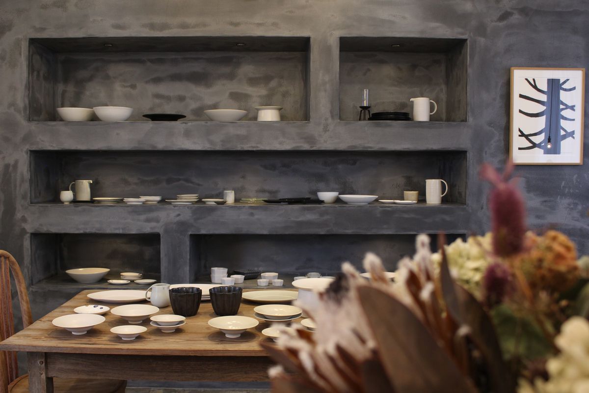 うつわがまるでアート作品に見えるような壁面の造作棚も印象的