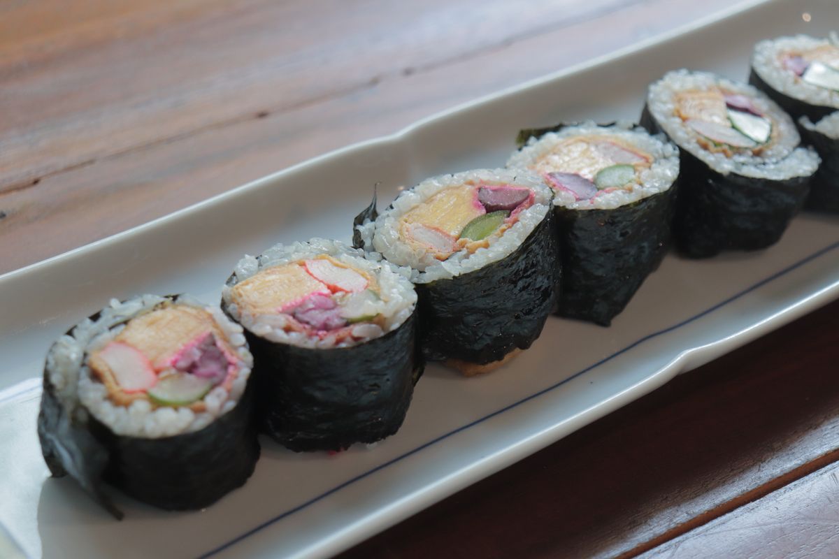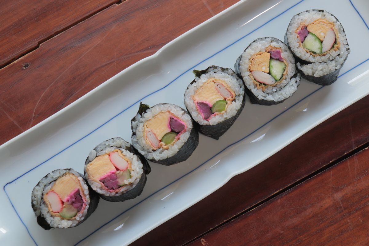 6.ご飯の上に3で具材を詰めたすしあげをのせ、巻く。しっかりと巻けるようにラップで巻いてしばらく置いておく。半分に切ったら完成!